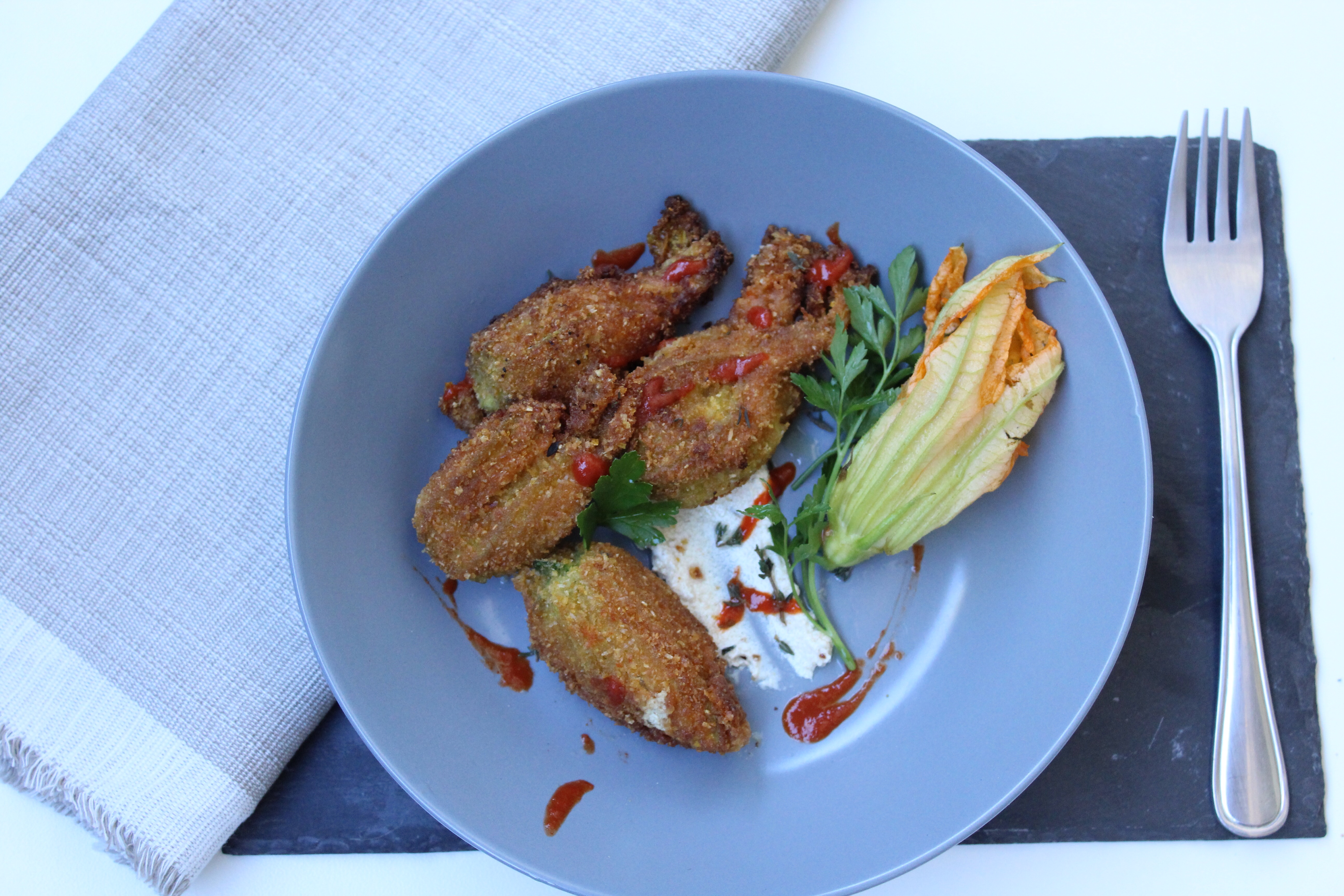 Forget a bouquet of ordinary flowers, for me a lush bouquet of Courgette blossoms will more than suffice! Not knowing this before but there are quite a few things one can do with Courgette flowers, other than stuffing and deep frying like I did, you can roast them with your vegetables, toss them into a quick salad or grill them to get an interesting smokey chargrilled taste. I rinsed the blossoms off with water and removed the stamen inside, to give the stuffing an interesting twist, I toasted ground cumin and coriander and ground it in a pestle and motar to extract the full flavour and pungency of the spices, I then added the Goat’s cheese (you can add Ricotta instead, if you’re not a fan of Goat’s cheese) I drizzled extra virgin olive oil to bring it all together with a spritz of lemon juice and tiny bit of salt. This mixture was used to then stuff the flowers, dipping into egg mixture( just one egg beaten) and then tossed around in a breadcrumb and dessiccated coconut mixture and then deep fried in coconut oil. Coconut oil has so many benefits, I could go on and on about it and it’s many uses, the reason I used coconut oil instead of sunflower oil, is that it has a really high smoking point and of course the taste that coconut oil gives off is rather subtle and light. To plate up I used the left over stuffing as a base and dip, and drizzled a bit of Sriracha over for an extra kick. If like me, you’re not a big fan of the Jalapeño Poppers, then this is the perfect balance between spicy and tangy without being overpoweringly hot.