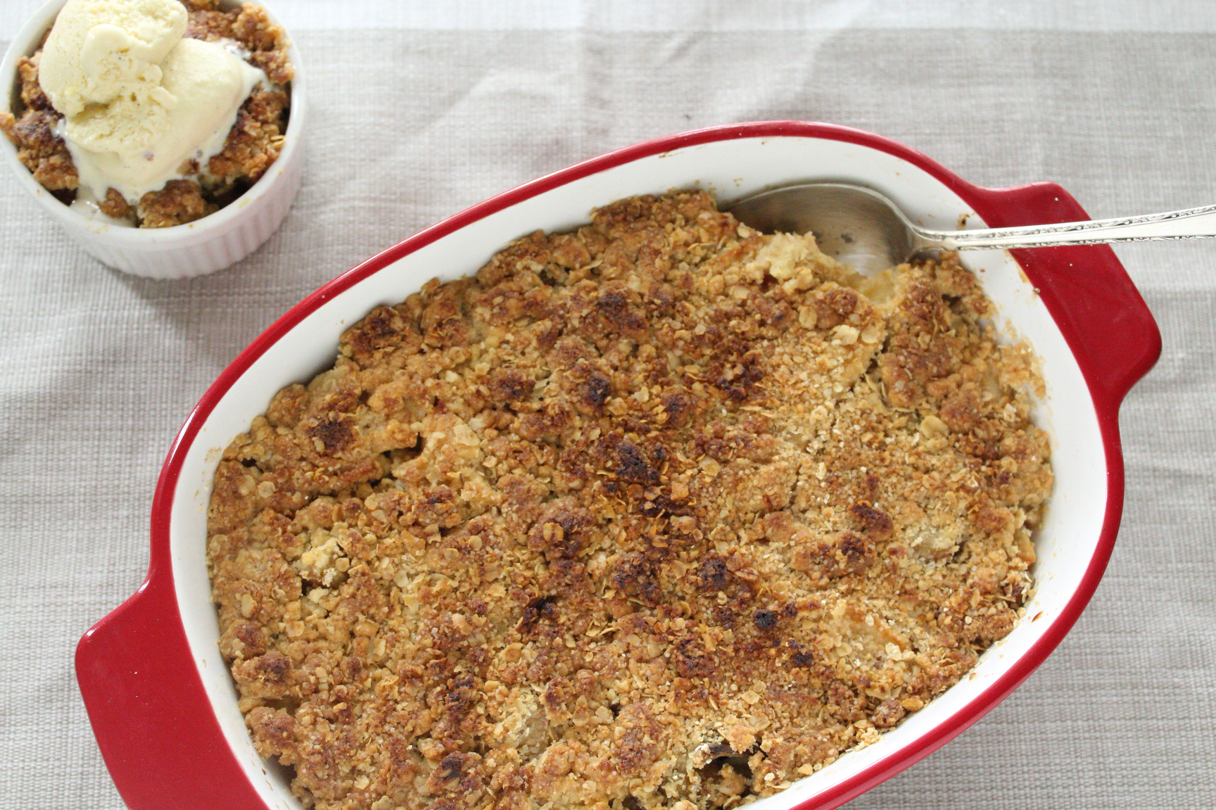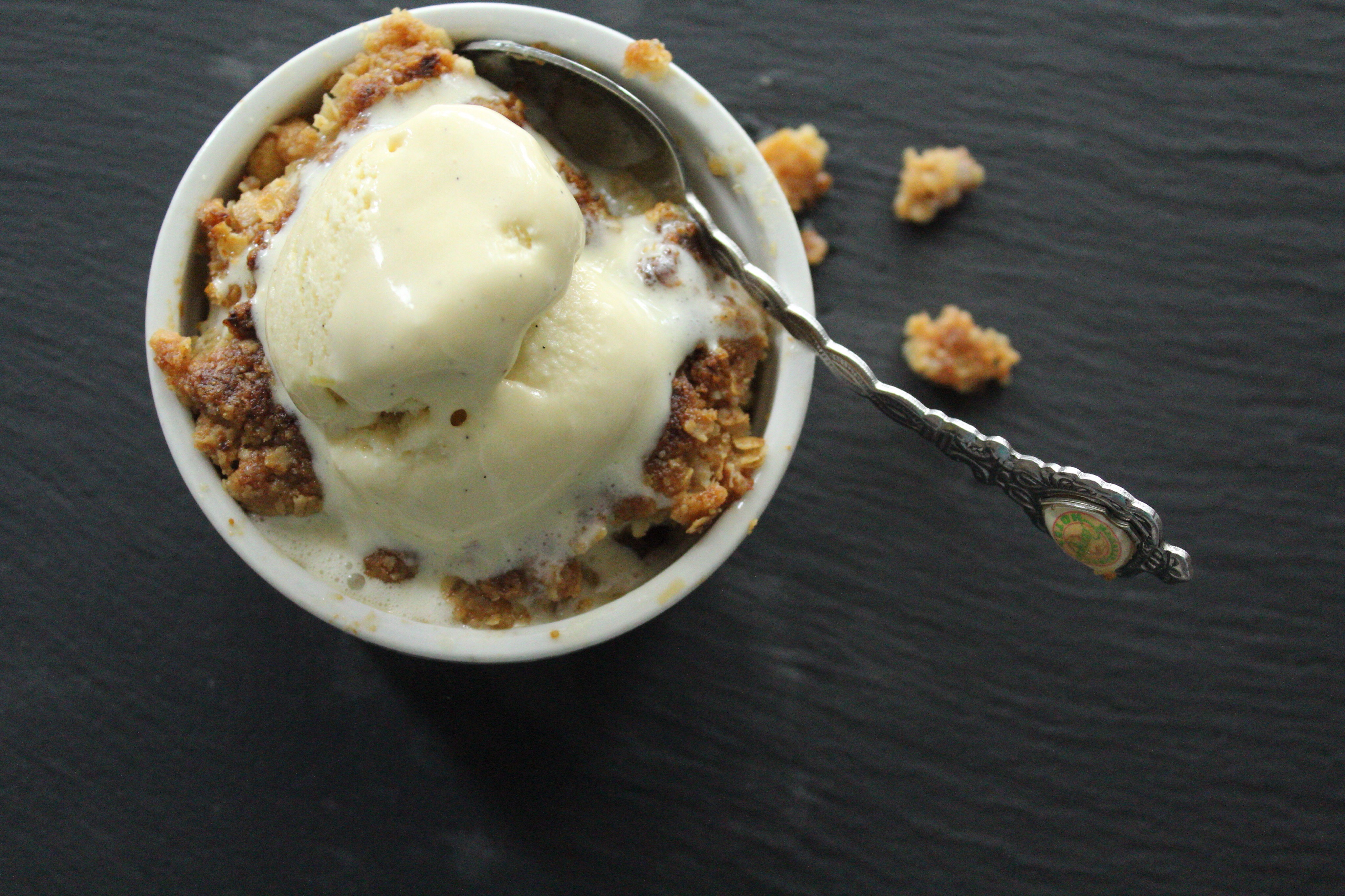As you know by now, there’s not much I love more than fresh and seasonal produce. I’m trying to be as experimental as can be, last week I bought a bunch of Rhubarb, having never before consumed it I was eager find out its flavour profile. I purchased the Rhubarb at Woolworths and found there was a handy little recipe for Apple and rhubarb crumble on the packaging. Fresh out of the oven served with a scoop of homemade ice cream, is possibly the best time to consume the tart dessert.