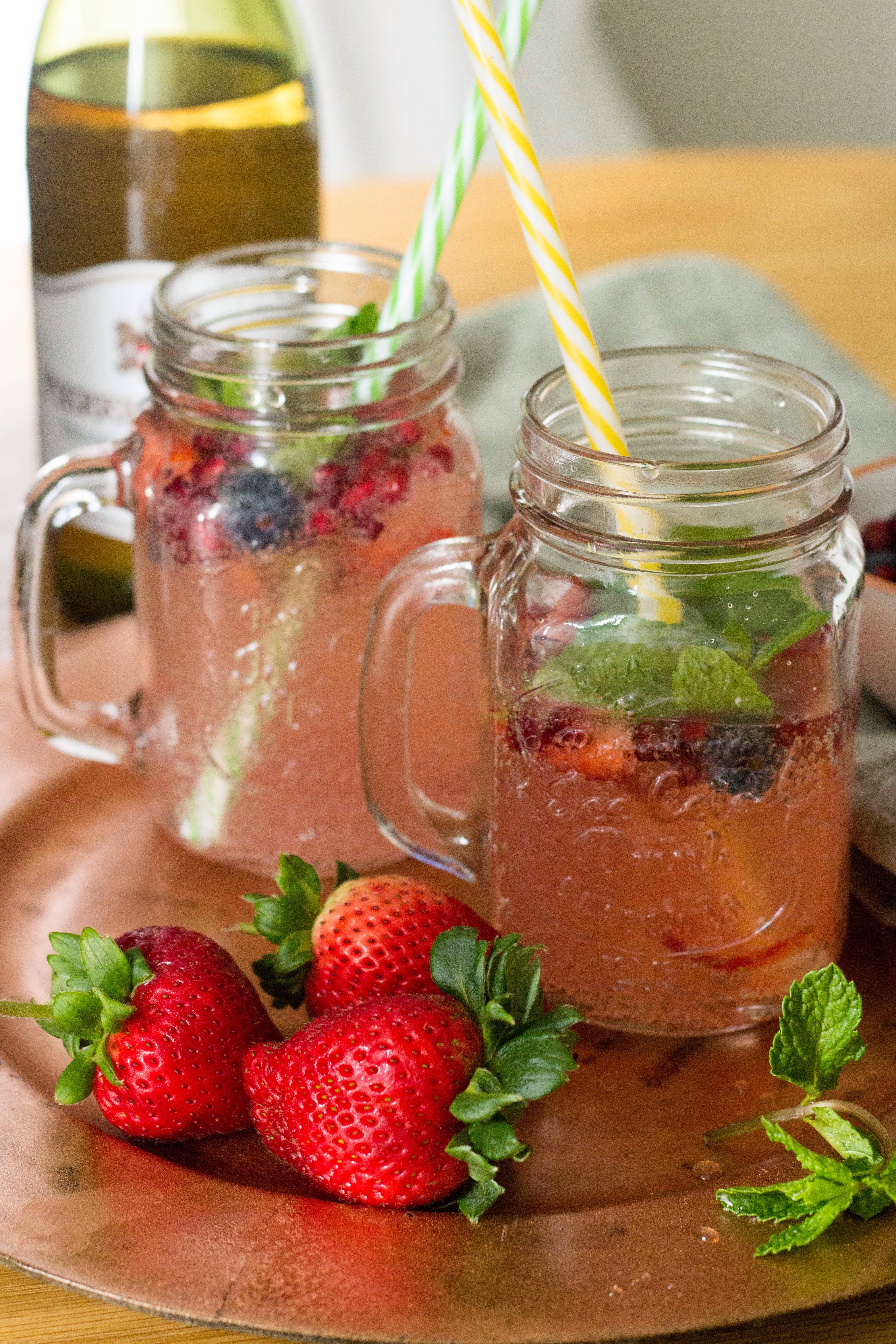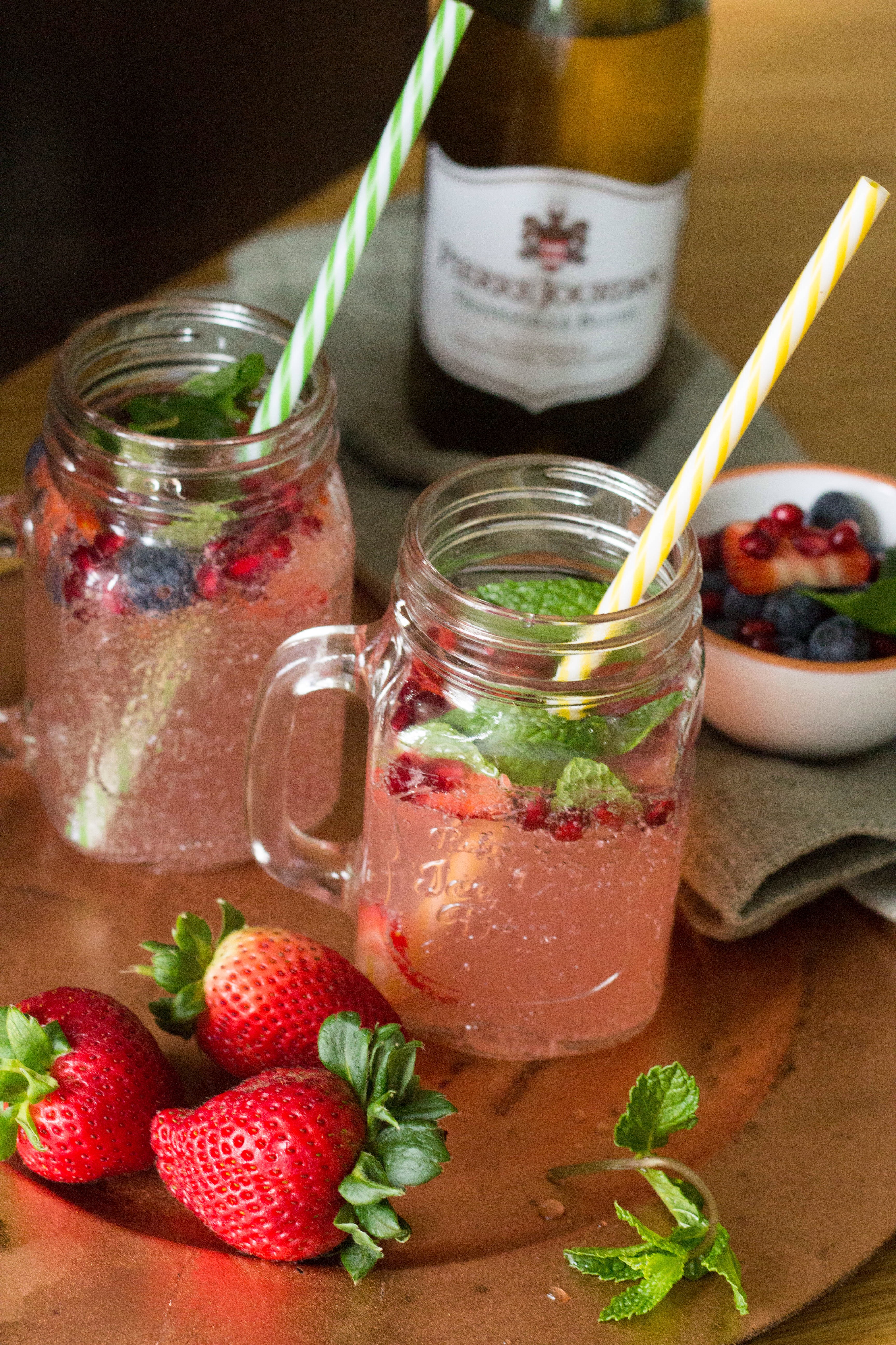 September in South Africa, means Spring is here, there are many debates and theories as to the actual official start of Spring. With the arrival of a new family member last week, I do feel there is much to celebrate and what better way with wine! I saw the recipe from Donna Hay and immediately felt inclined to recreate it. I used one of my favourite’s Pierre Jourdan Tranquille Blush from the Haute Cabriére wine estate and a lovely strawberry and mint syrup(store bought from Woolworths) with soda water and fresh berries and mint to garnish. Top tip: instead of ice which will water down your cocktails or wine spritz, freeze some grapes or berries and add to your drinks.