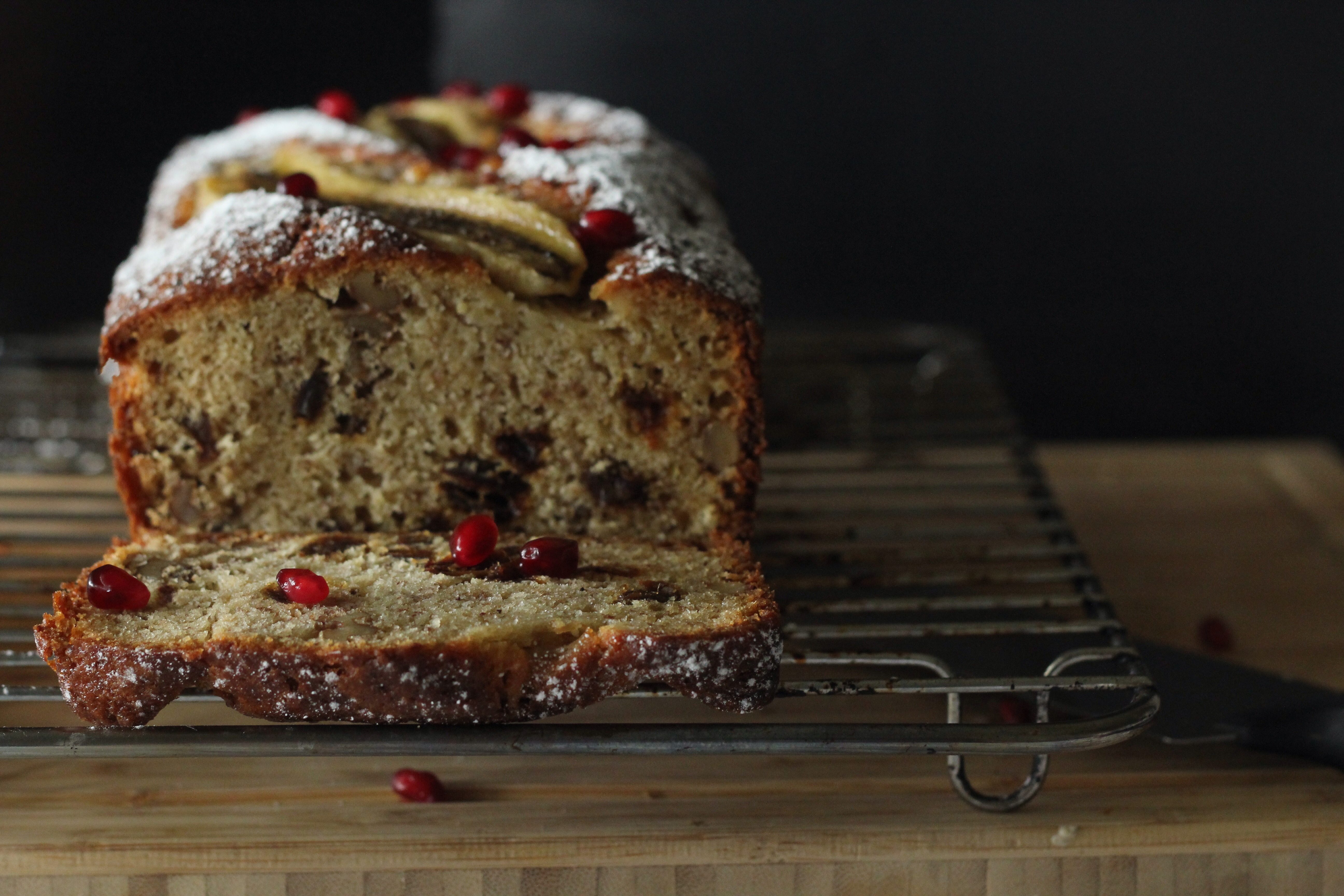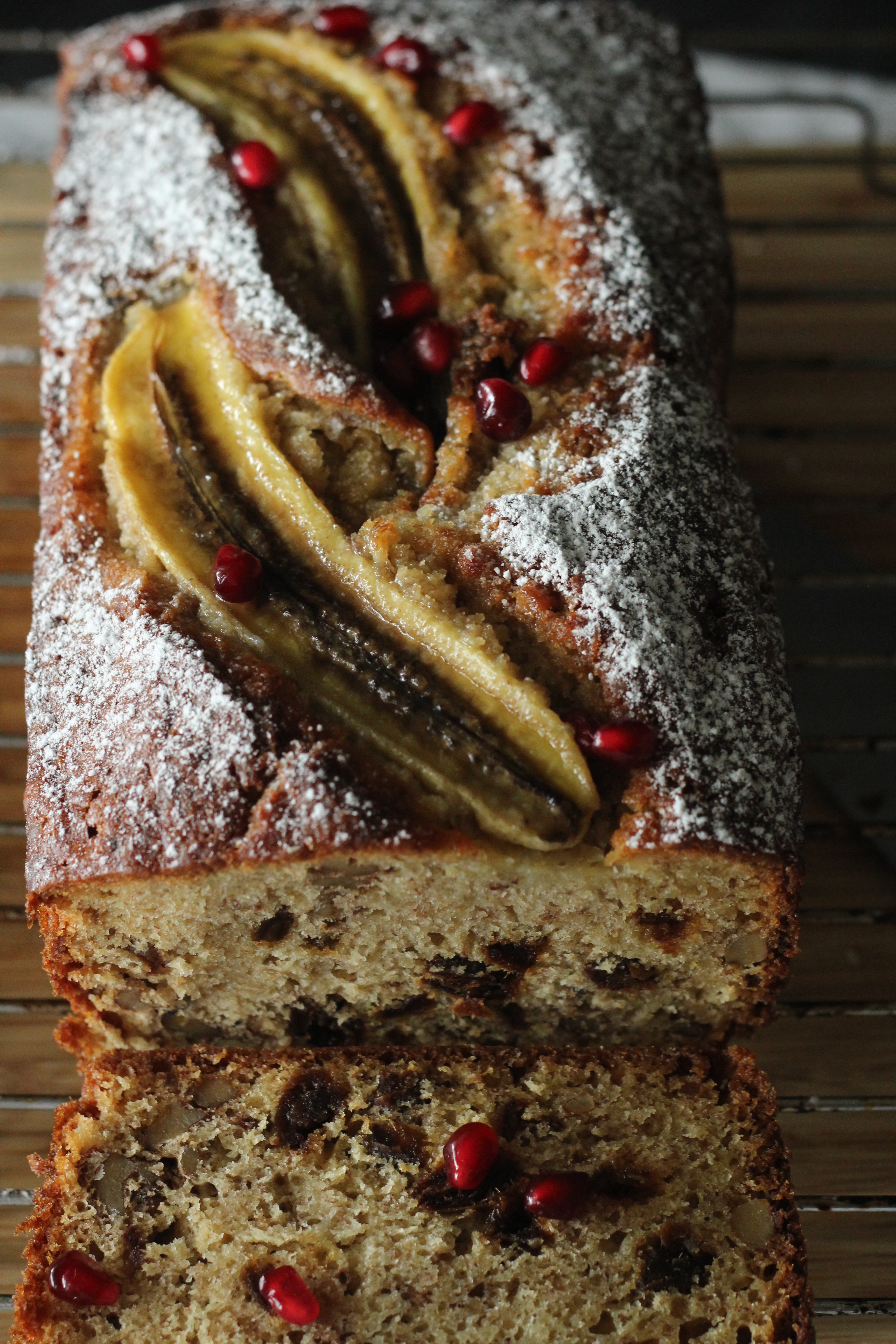 Recreating classics is what excites me although mindfully keeping the said ‘classic’s’integrity in tact.The recipe is from Woolworths Taste by Clement Pedro, who is now on Afternoon Express as their resident Chef. As always, I tweaked the recipe and added two more bananas, chopped walnuts and dried Medjool dates. I love the added texture the dates and the walnuts lend to the banana loaf,that said it has a ‘cake like’ soft texture too. I added a few Pomegranate rubies for a pop of colour, why not?