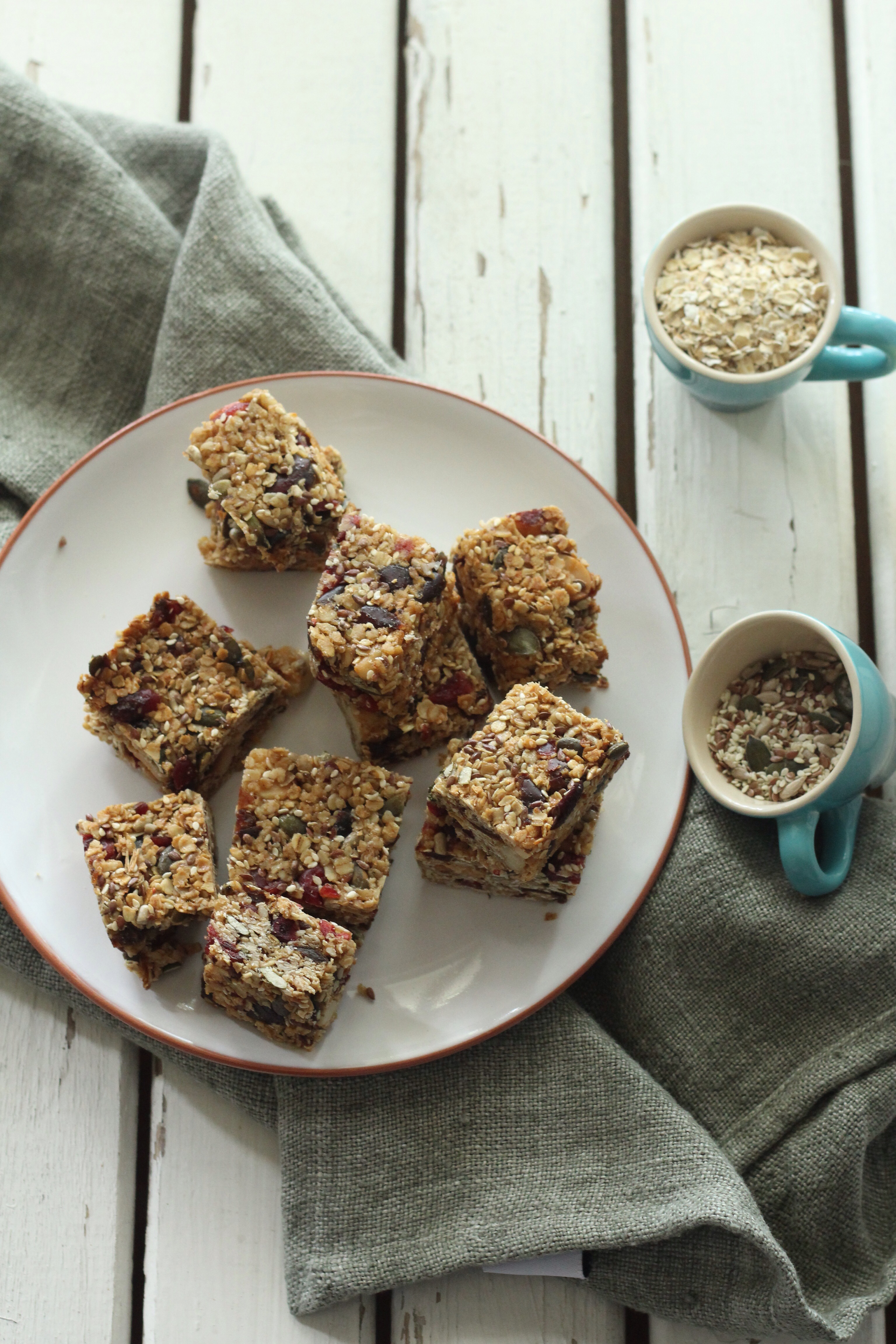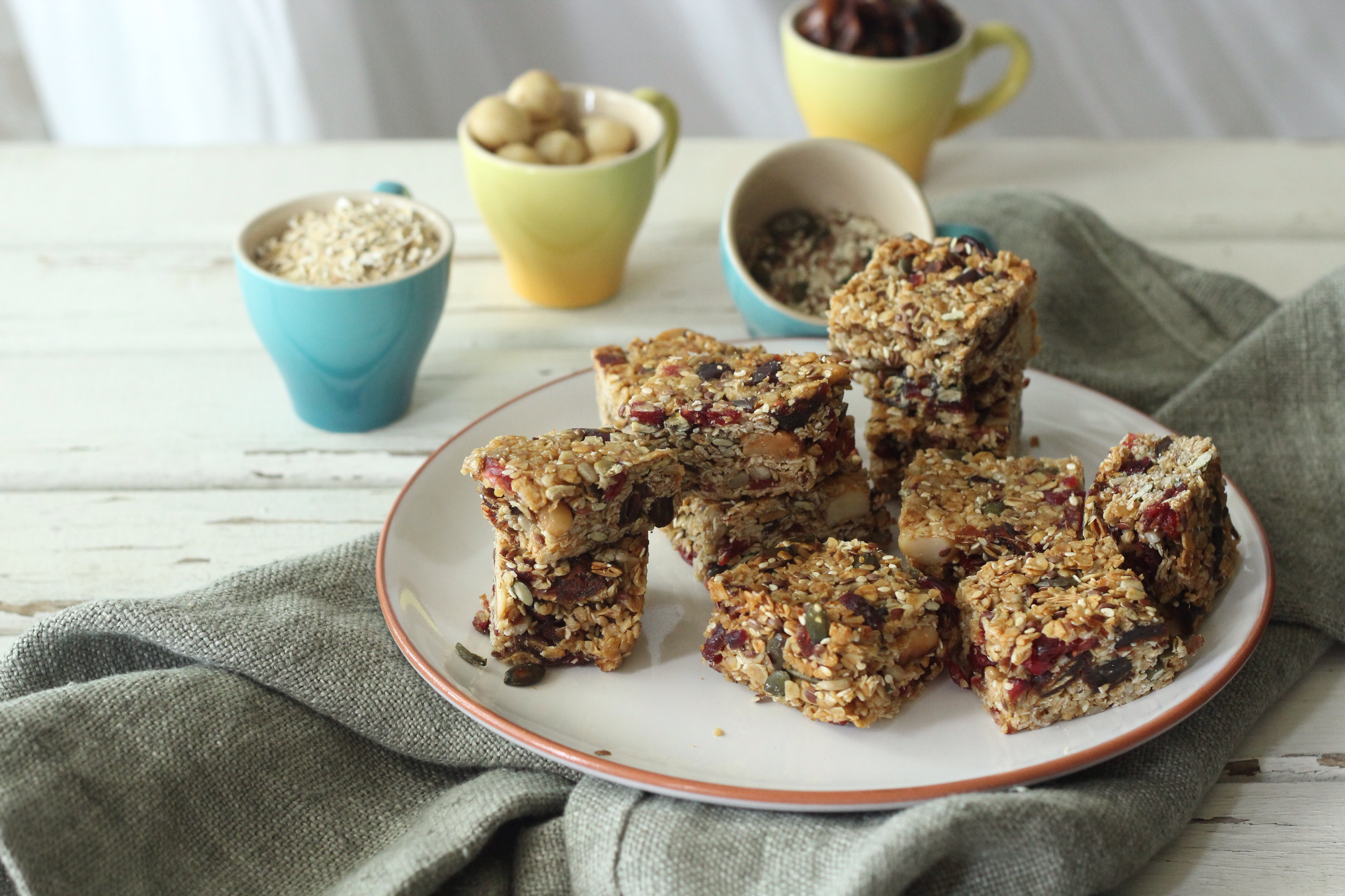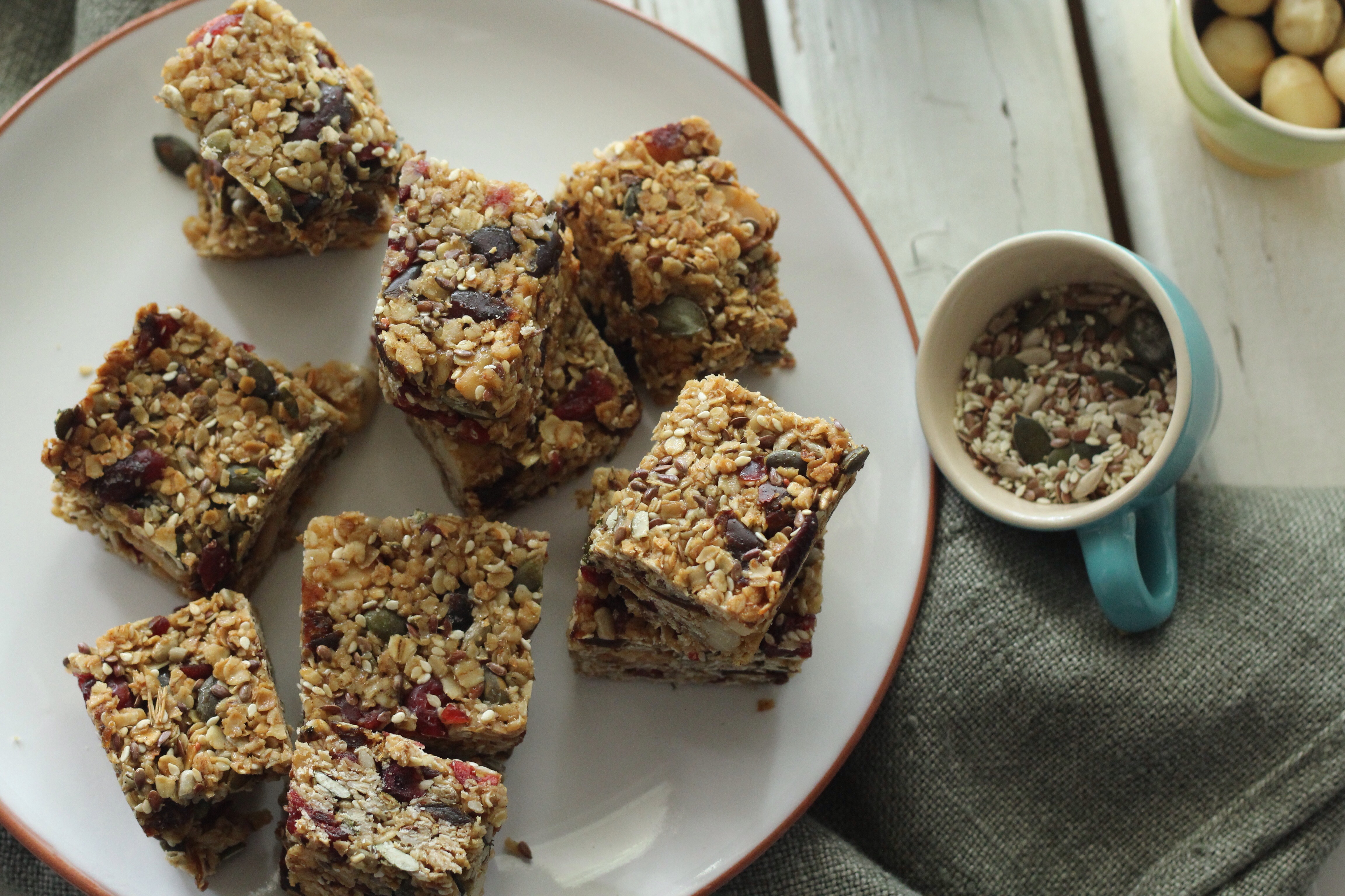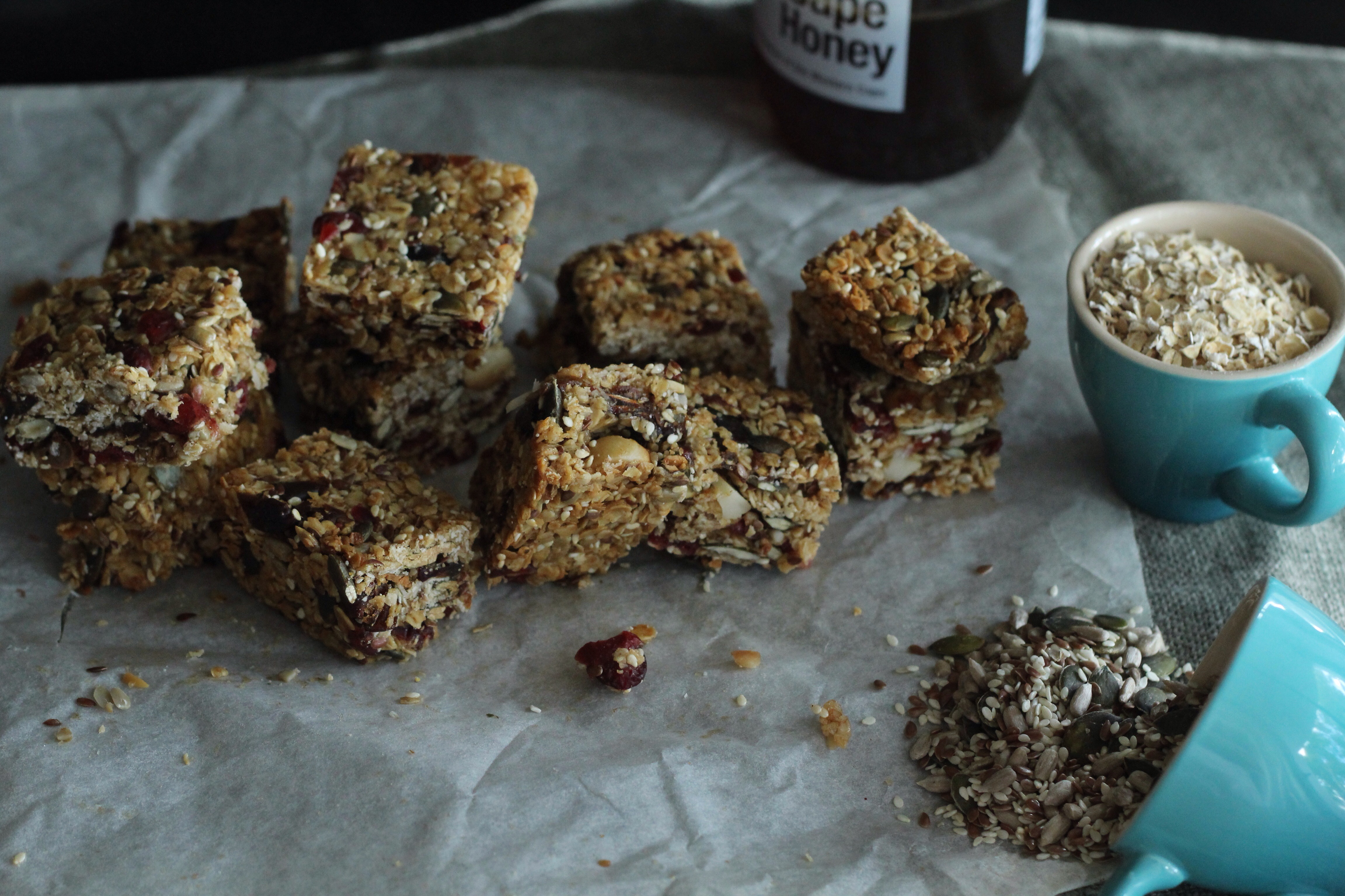 Sunday, I schleped my partner along to a prop and background sourcing haul at the Milnerton Flea market. Feeling quite chuffed with all my treasures I couldn’t wait to play around and shoot something with them. I made the granola bars on less than a few hours sleep and much zeal after my haul. I couldn’t believe how easy and fuss free the recipe was, I toasted the oats and nuts along with a seed mix which consists of pumpkin, linseeds, sunflower and sesame seeds and added to all the ingredients along with the melted coconut oil and warmed honey pressed down firmly in a parchment fitted pan and baked for 15 minutes. Allow to cool completely in the pan before slicing. I cooled in the fridge to set further, to have a more firm and chewey texture you don’t have to do this(I just wanted to be sure that this time when I cut into the bars they won’t fall apart instantly). It was indeed love at first bite, I love the crunch and saltiness of the salted and roasted macadamia nuts and the tartness of the cranberries married with the sweetness of the dates.A match made in heaven. I love how I can control what goes into the bars, as opposed to the mysterious artificial ingredient packed store bought ones. I make these scrummy bars for my partner to take along to work as a midday ‘pick me up’ snack and the bars are great for kids to take along to school for a healthy energy boost.