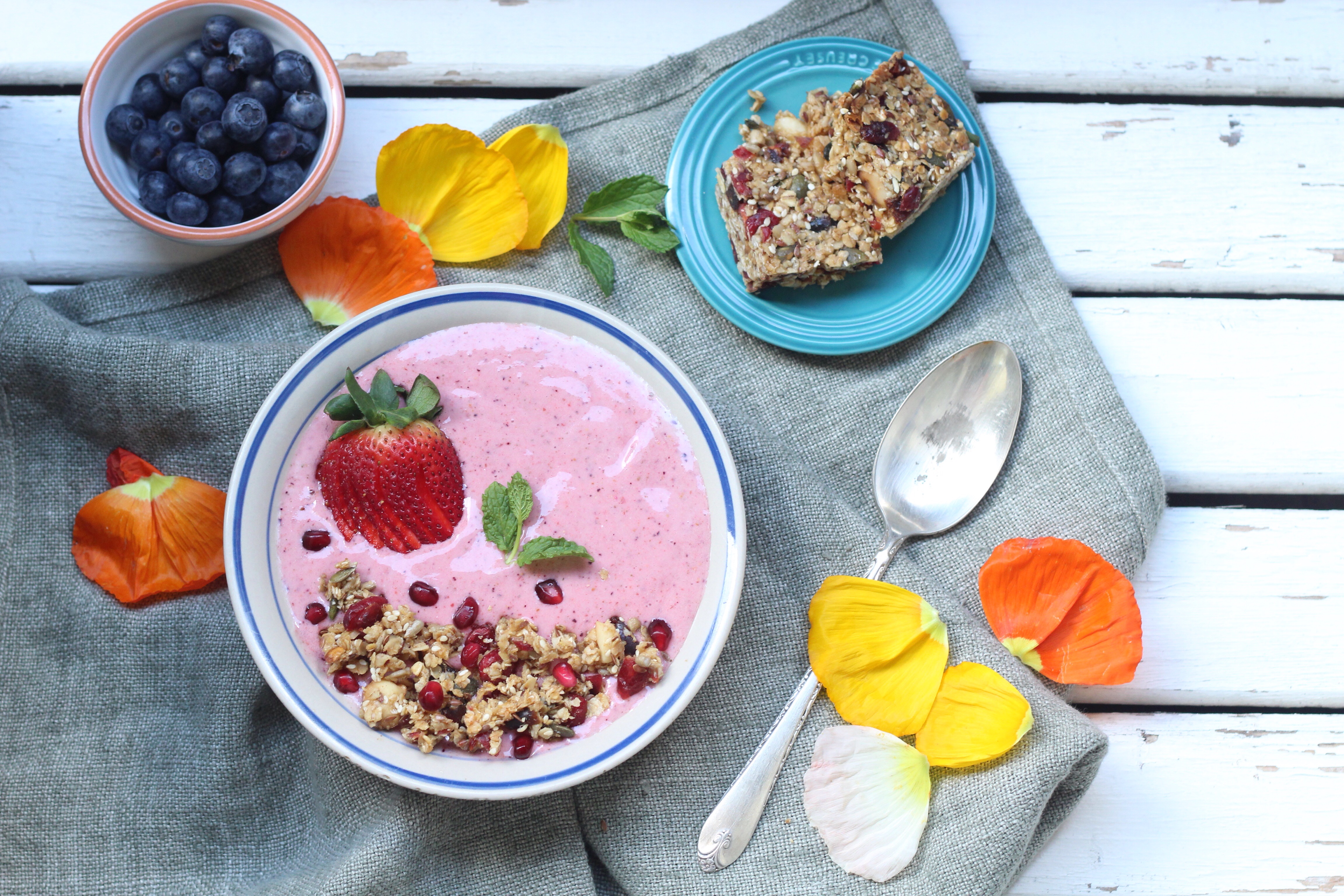 I decided to make a smoothie bowl as a great idea to use the granola bars as part of a full breakfast meal, the quick and easy on the go option might not be for all. I used my trusty NutriBullet to blitz up berries, frozen banana slices, coconut milk and water to thin it down. serve in a bowl or cup with the crushed granola bar pieces.