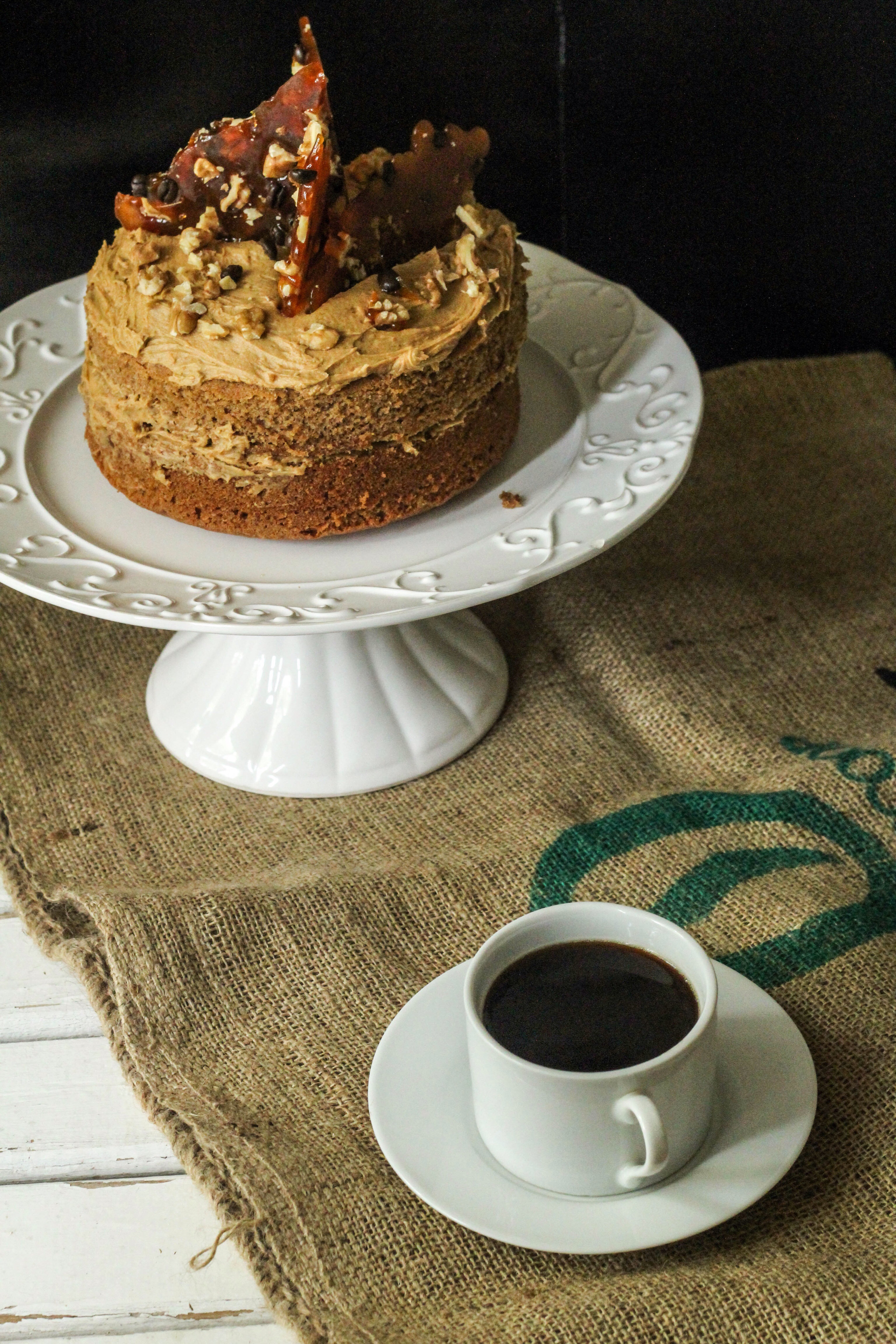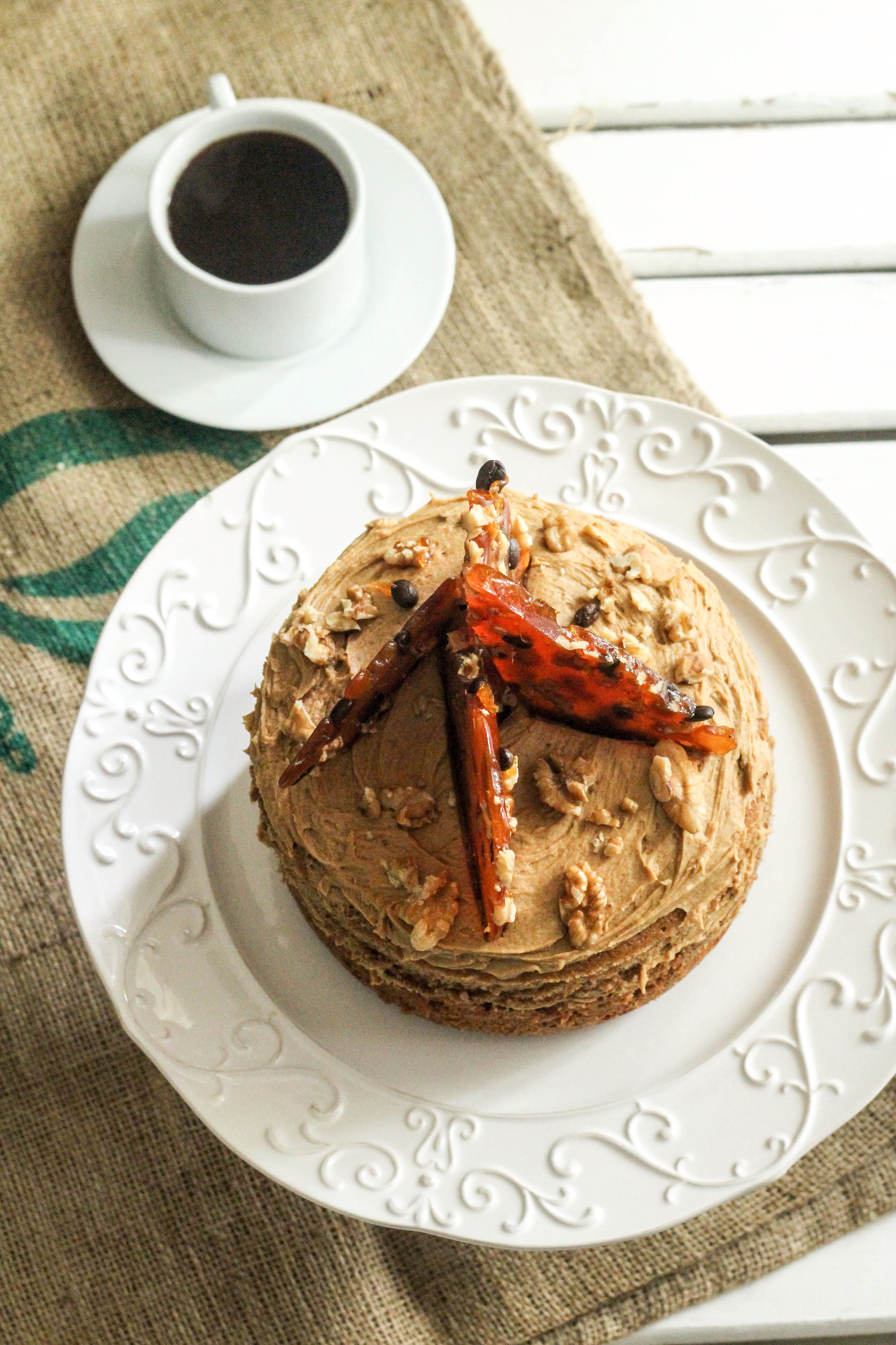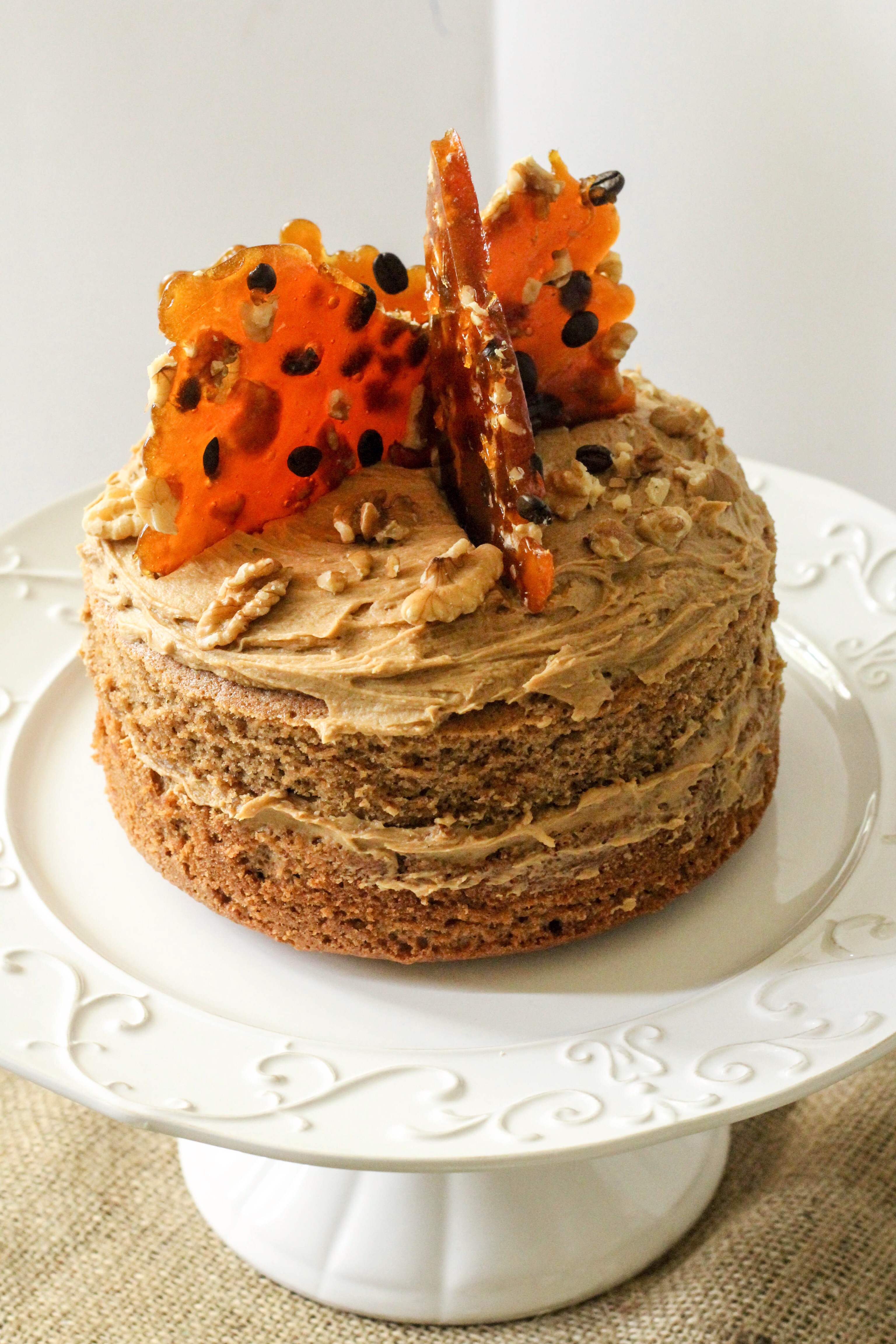 For the praline I melted 220grams of caster sugar in a non stick pan over a medium to high heat, swirling to fully incorporate. Once caramel brown, take off the heat and pour over coffee beans and chopped walnuts (preferably on a silpat) or on a greased and lined tray, leave to cool completely, then snap and arrange on the cake once the frosting is on. The praline provides height to the aesthetic of the cake and texture to the taste.