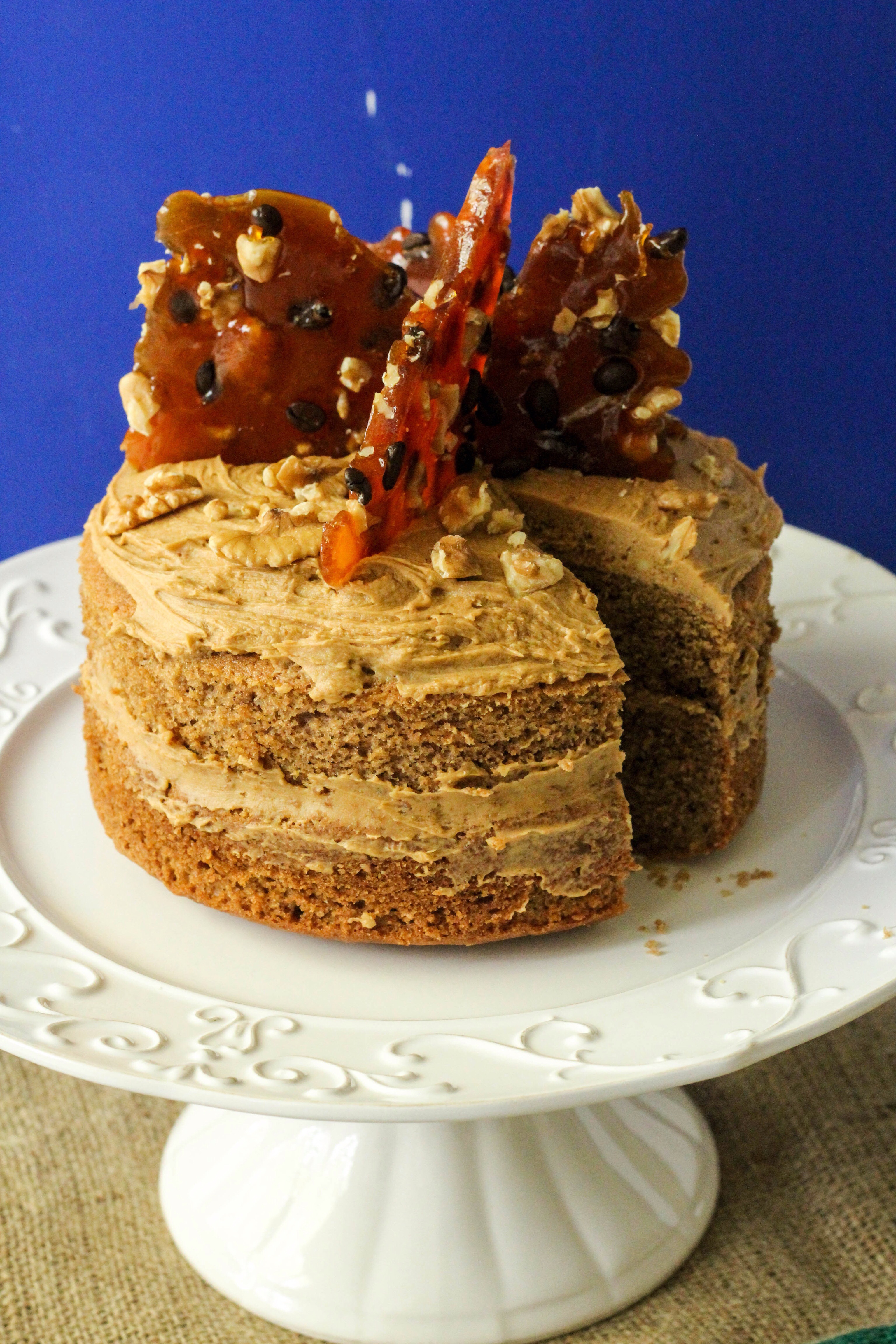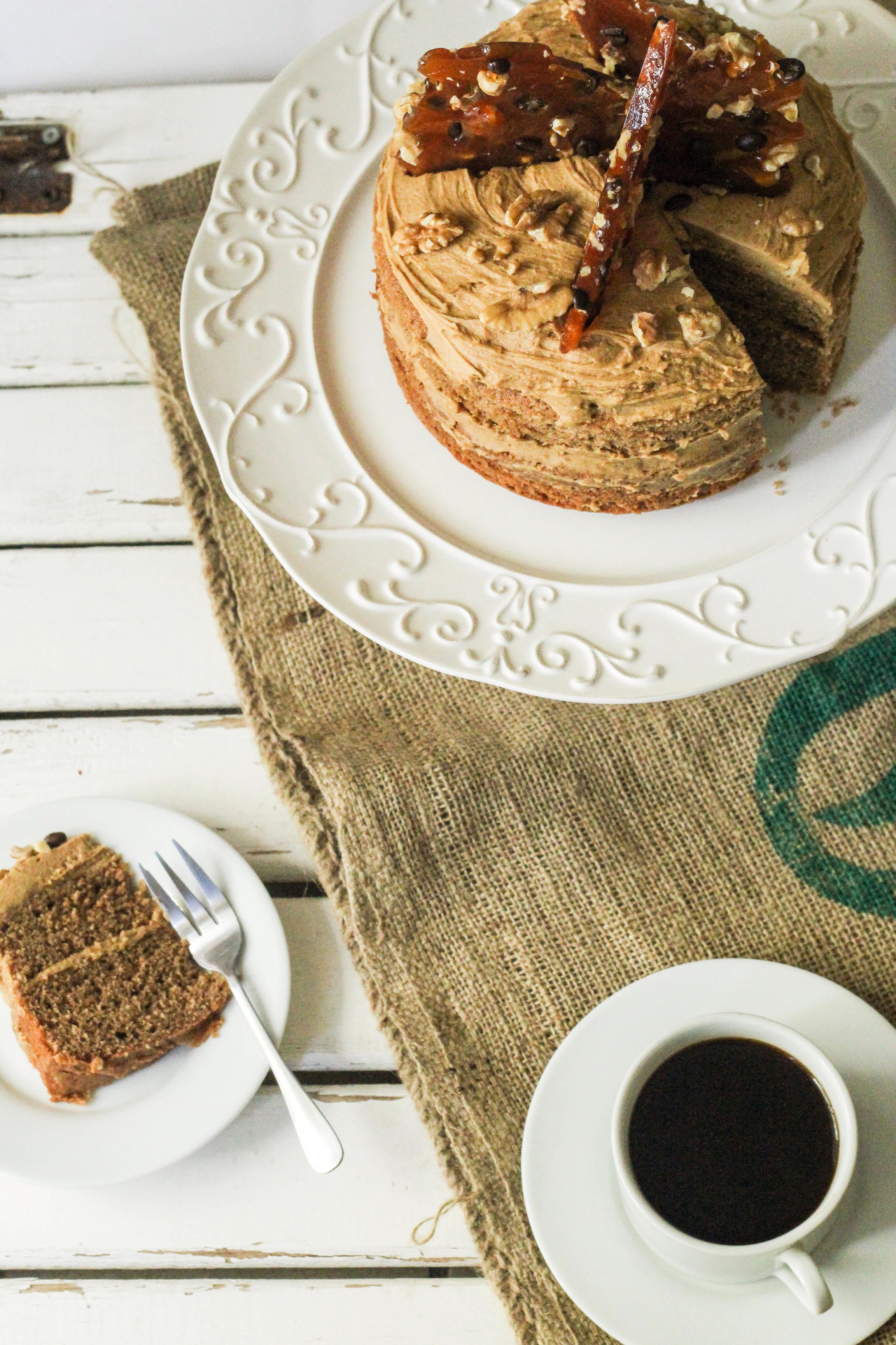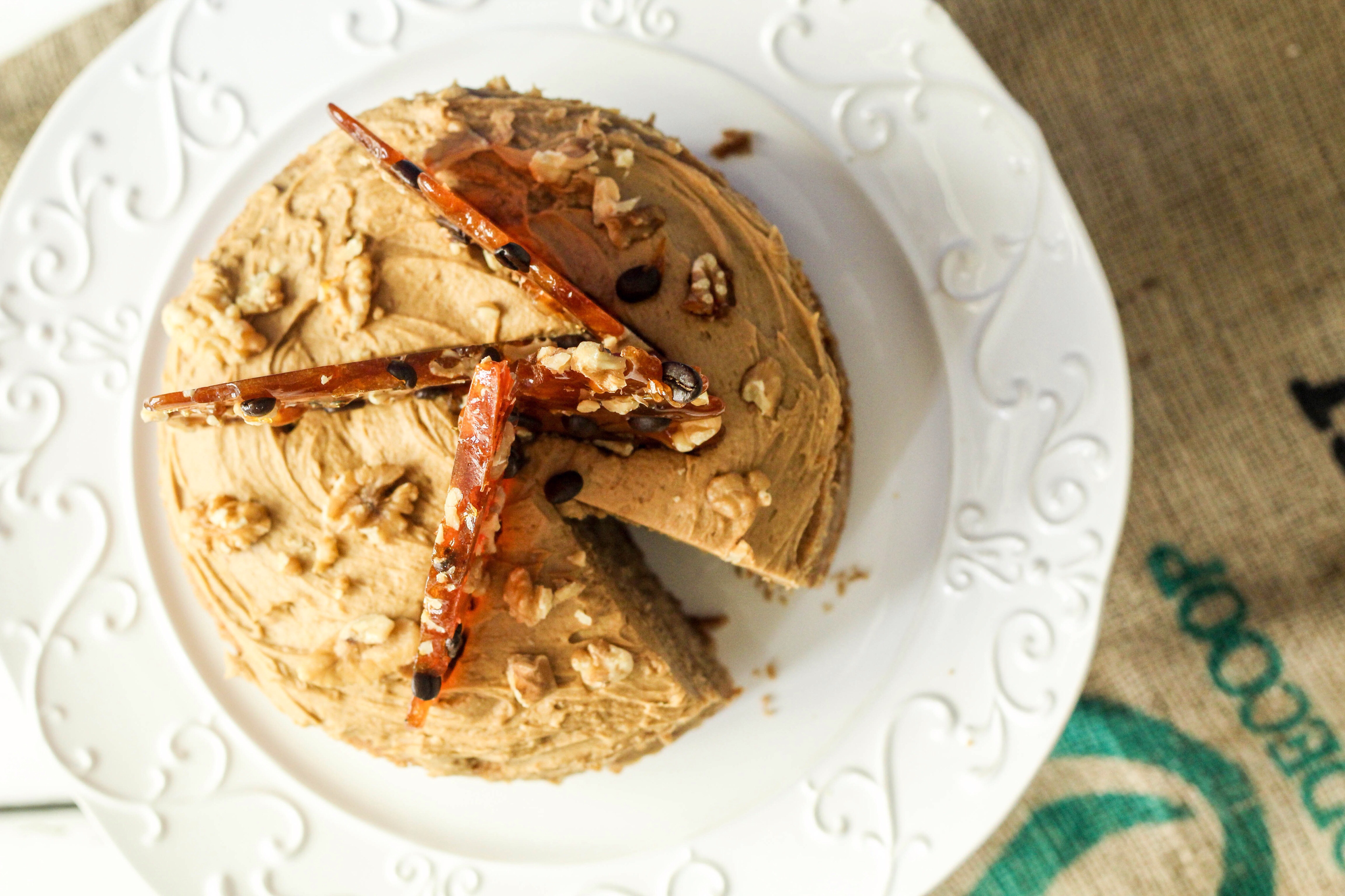 For the praline I melted 220grams of caster sugar in a non stick pan over a medium to high heat, swirling to fully incorporate. Once caramel brown, take off the heat and pour over coffee beans and chopped walnuts (preferably on a silpat) or on a greased and lined tray, leave to cool completely, then snap and arrange on the cake once the frosting is on. The praline provides height to the aesthetic of the cake and texture to the taste.