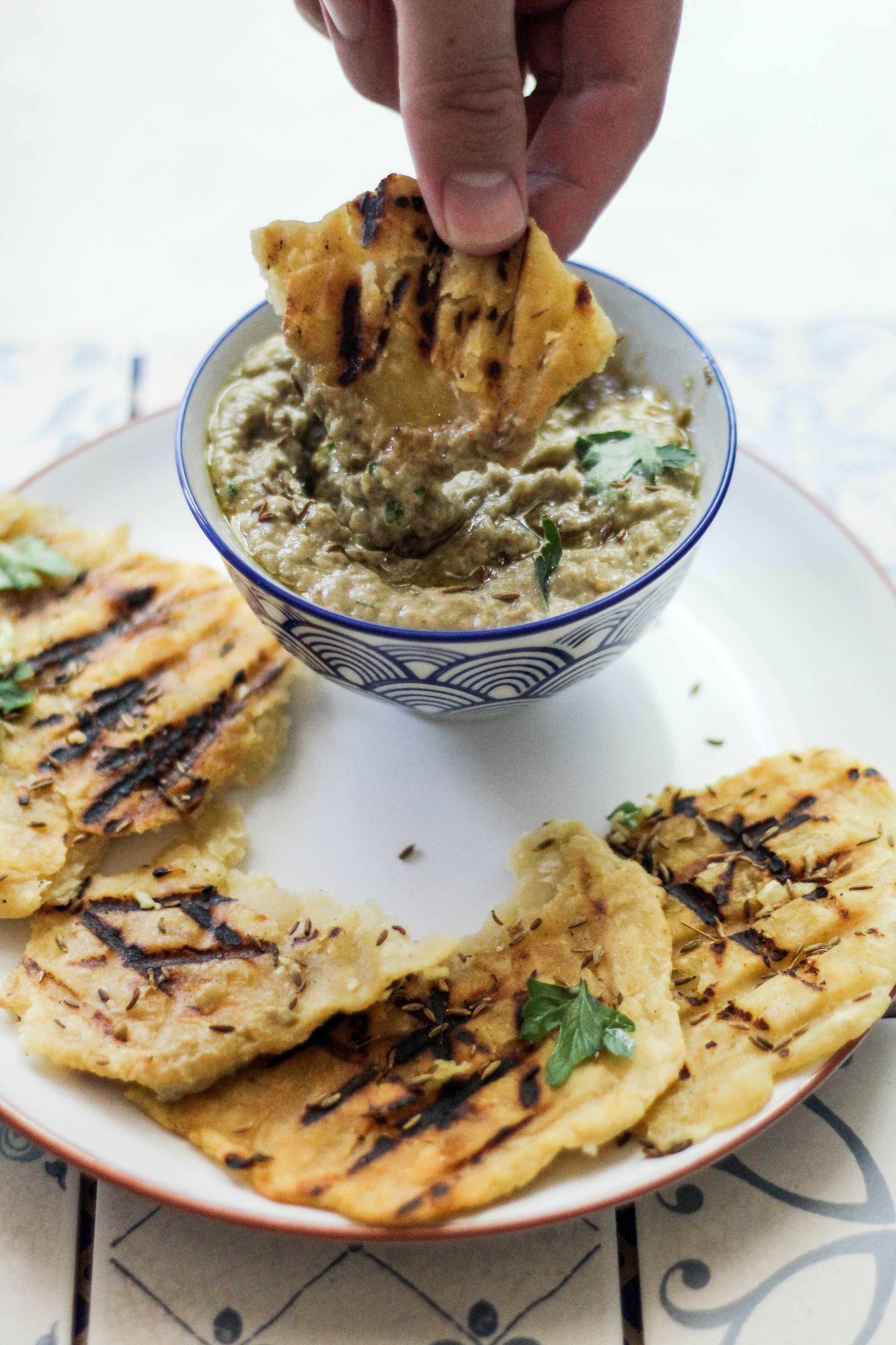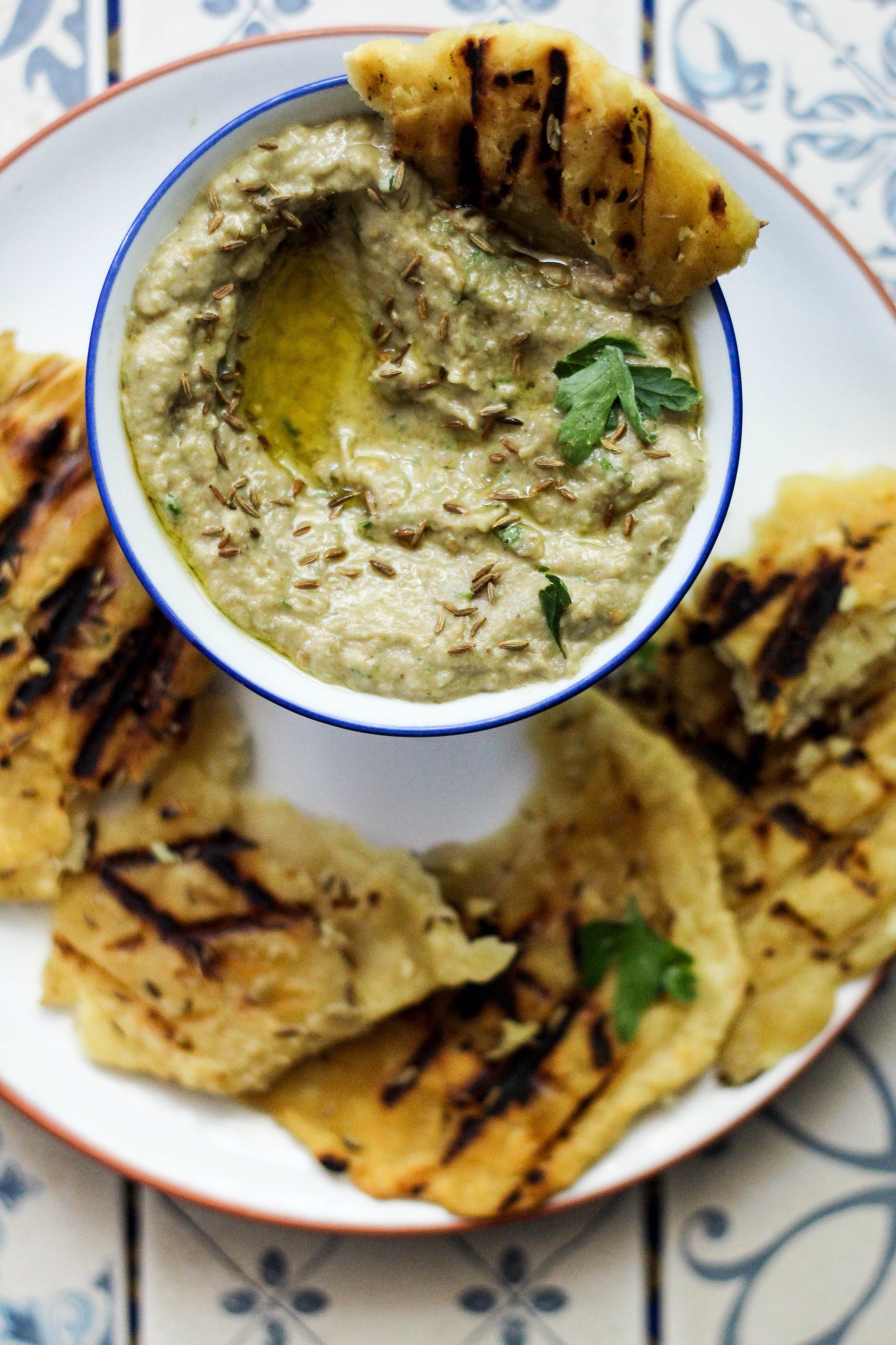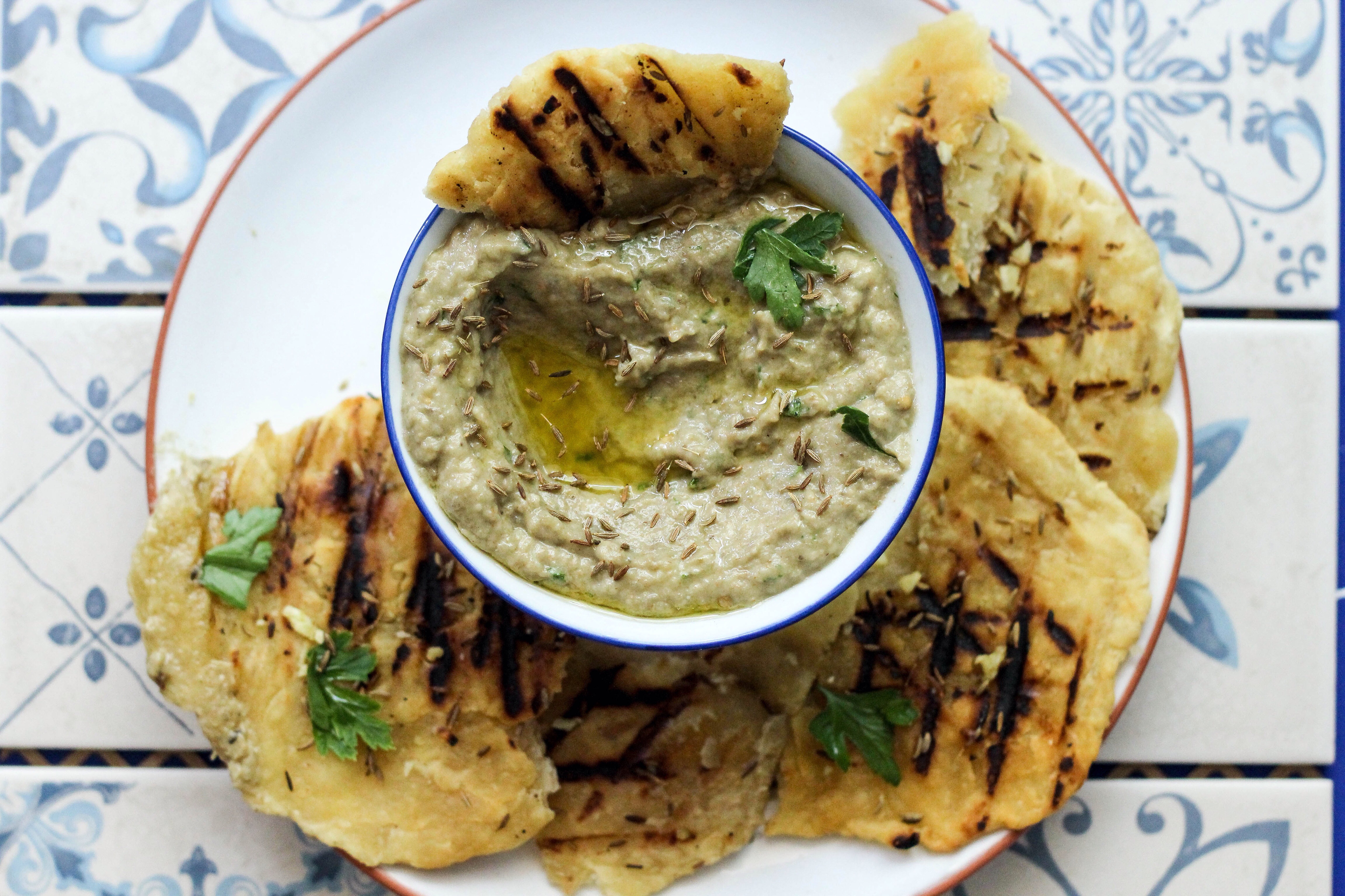 Place aubergines in roasting dish and roast for 45 minutes turning them halfway through. Once cooked, remove from oven and allow to cool completely before scooping out all of the flesh from the aubergines with a spoon. Toast the cumin in a hot pan until fragrant and darker in colour but shouldn’t turn black(shake every few minutes when toasting to avoid burning) place all of the aubergines flesh into a food processor or NutriBullet with the olive oil, garlic, tahini, cumin and parsley, then blitz. Add the lemon juice a little at a time, so as to avoid the mixture becoming too runny. Season to taste and serve with chopped radishes or with some fresh flat breads.