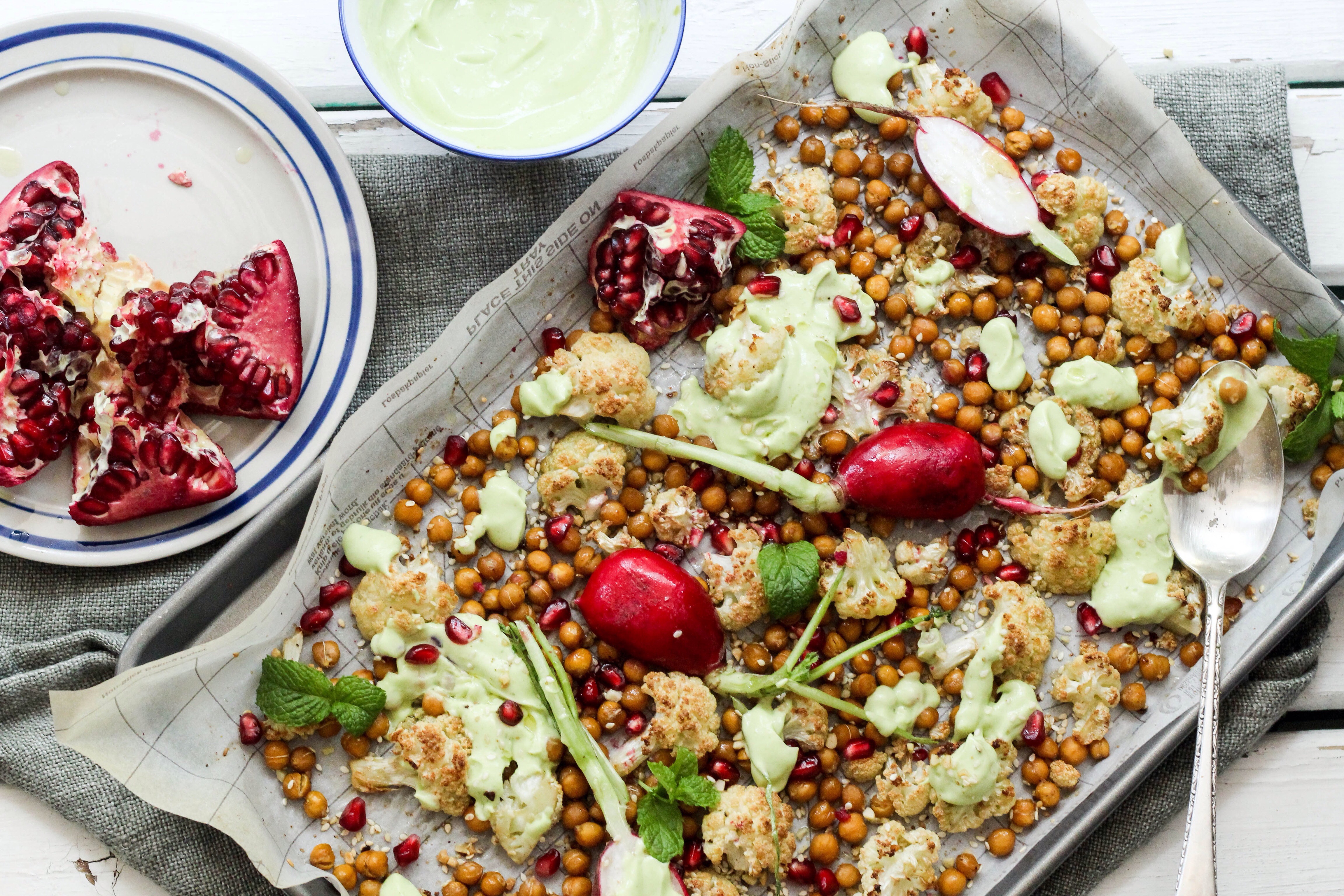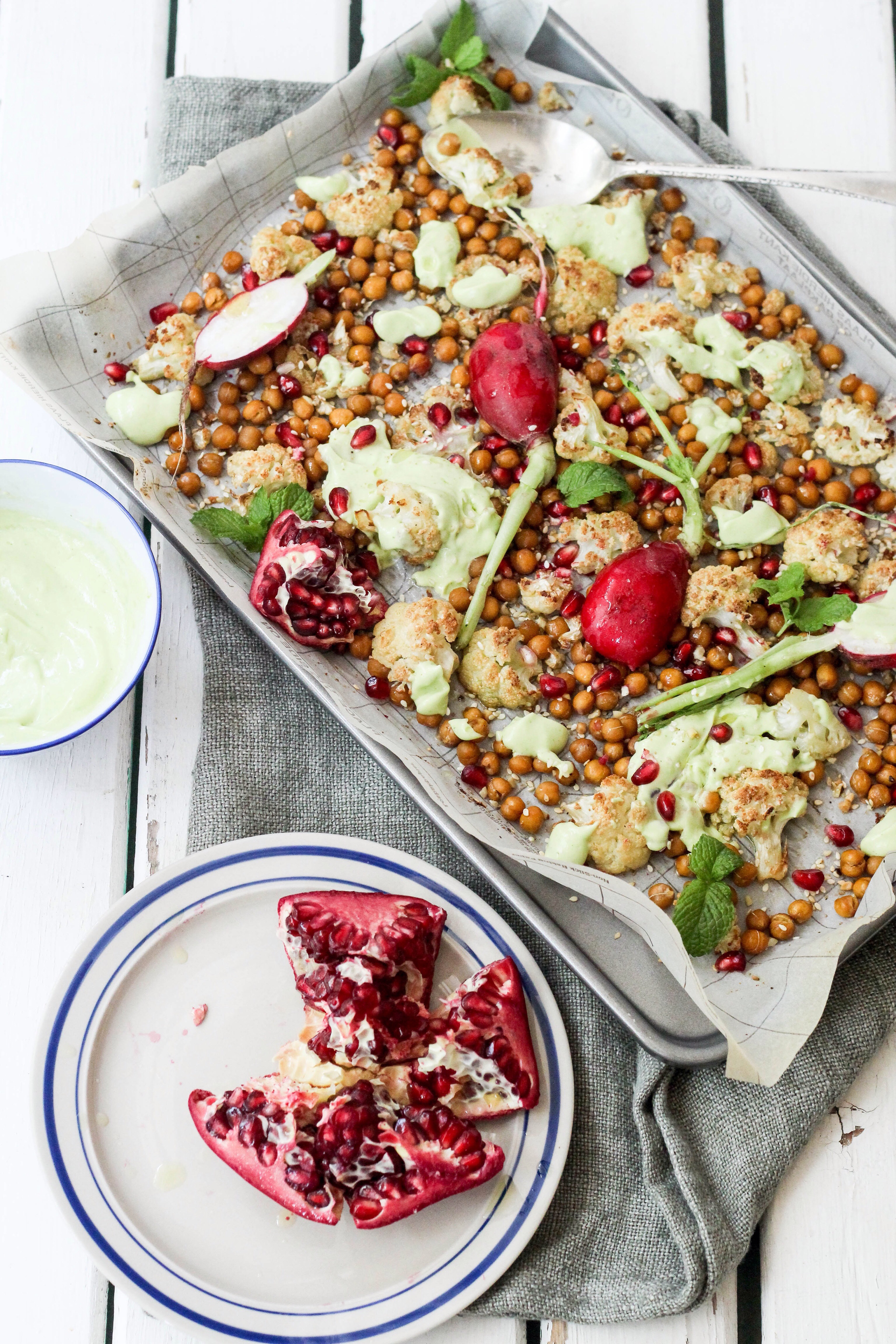 I made Egyptian dukkah roasted cauliflower florets and chickpeas with a creamy avocado and yoghurt dressing, served with crunchy radishes, fragrant mint and sweet pomegranate rubies. The recipe is from Donna Hay.What I love about this dish is that it’s everything but boring, the roasted cauliflower florets, lends a nuttiness to the dish together with the crunchy chickpeas which takes the texture of the dish to another level. The creamy avocado and yoghurt dressing is the perfect addition to the dish, it adds freshness and texture too.