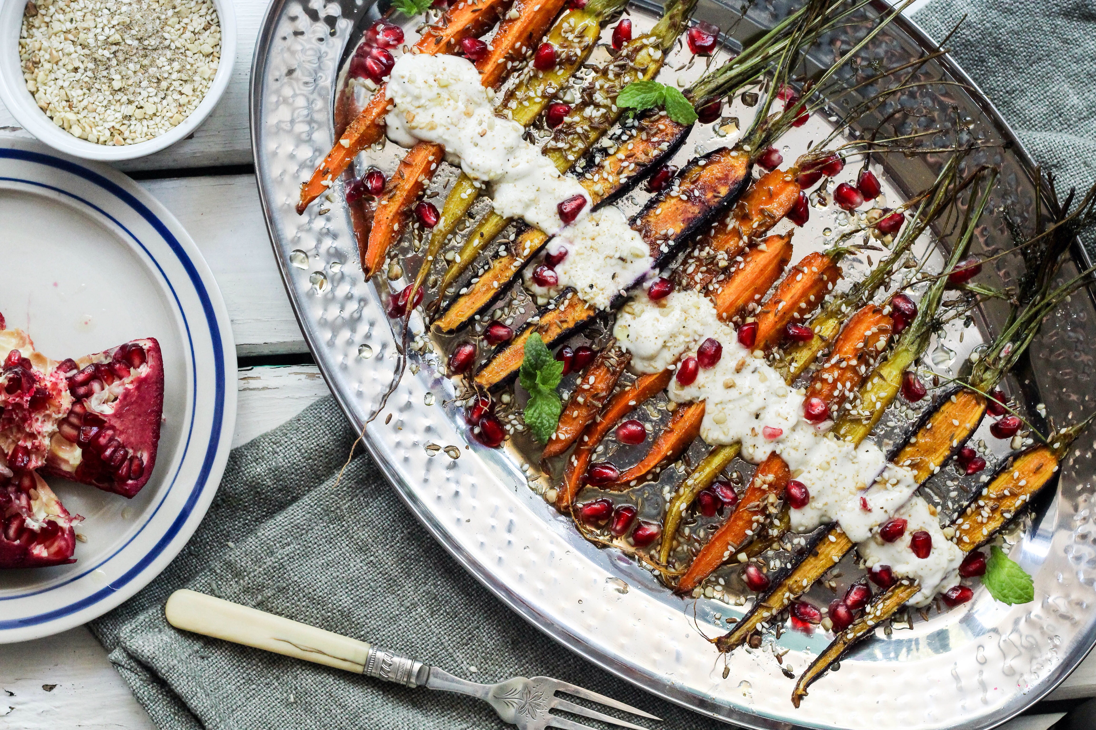 I drizzled this gorgeous dressing over the carrots to serve with a few pomegranate rubies and a few sprigs of mint to garnish. Inspired by the above roasted cauliflower and chickpeas recipe from Donna Hay, I developed the roasted carrot recipe with the same flavours in mind. There are so many other vegetables you could use and make it your own with your own twist. More importantly have fun!