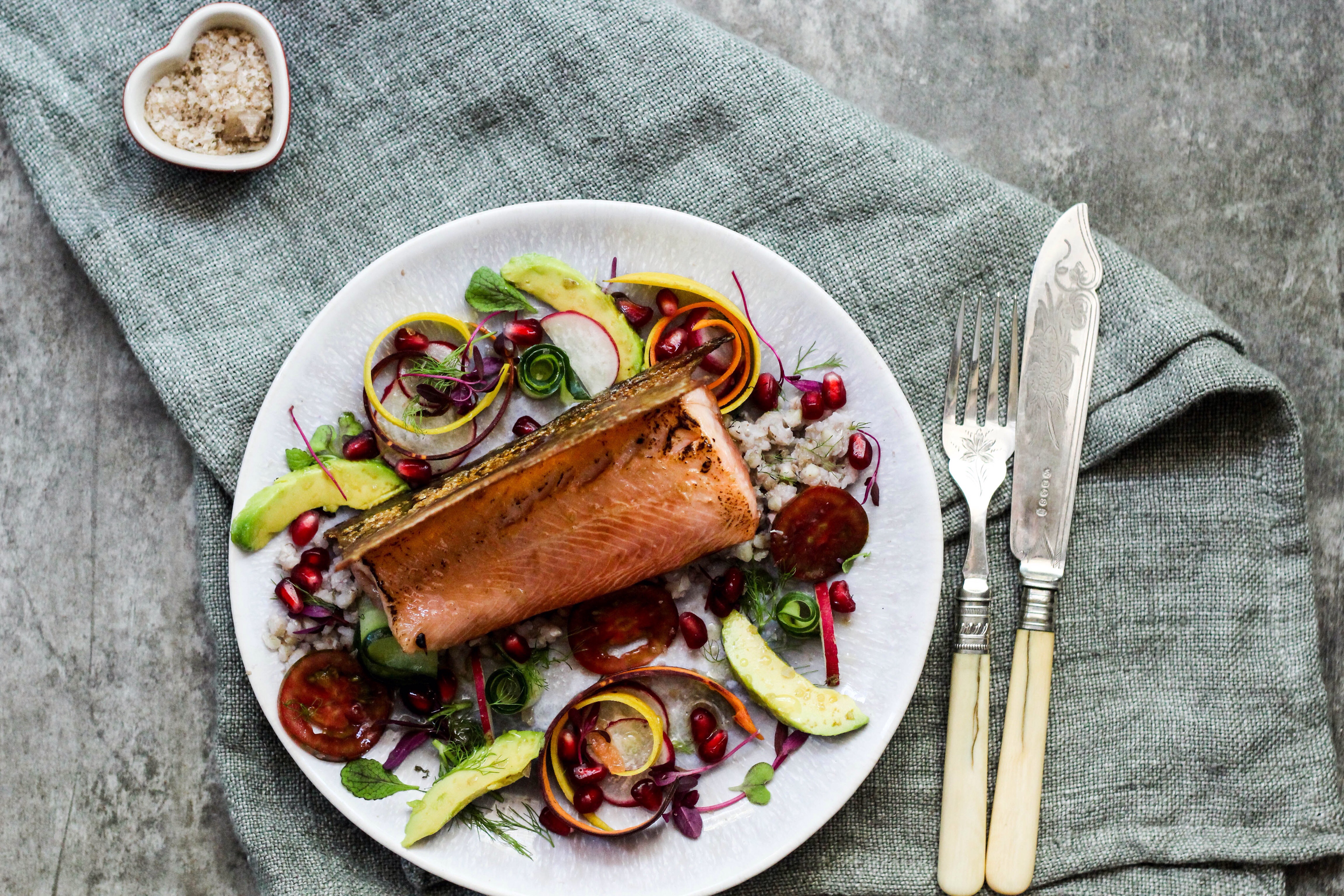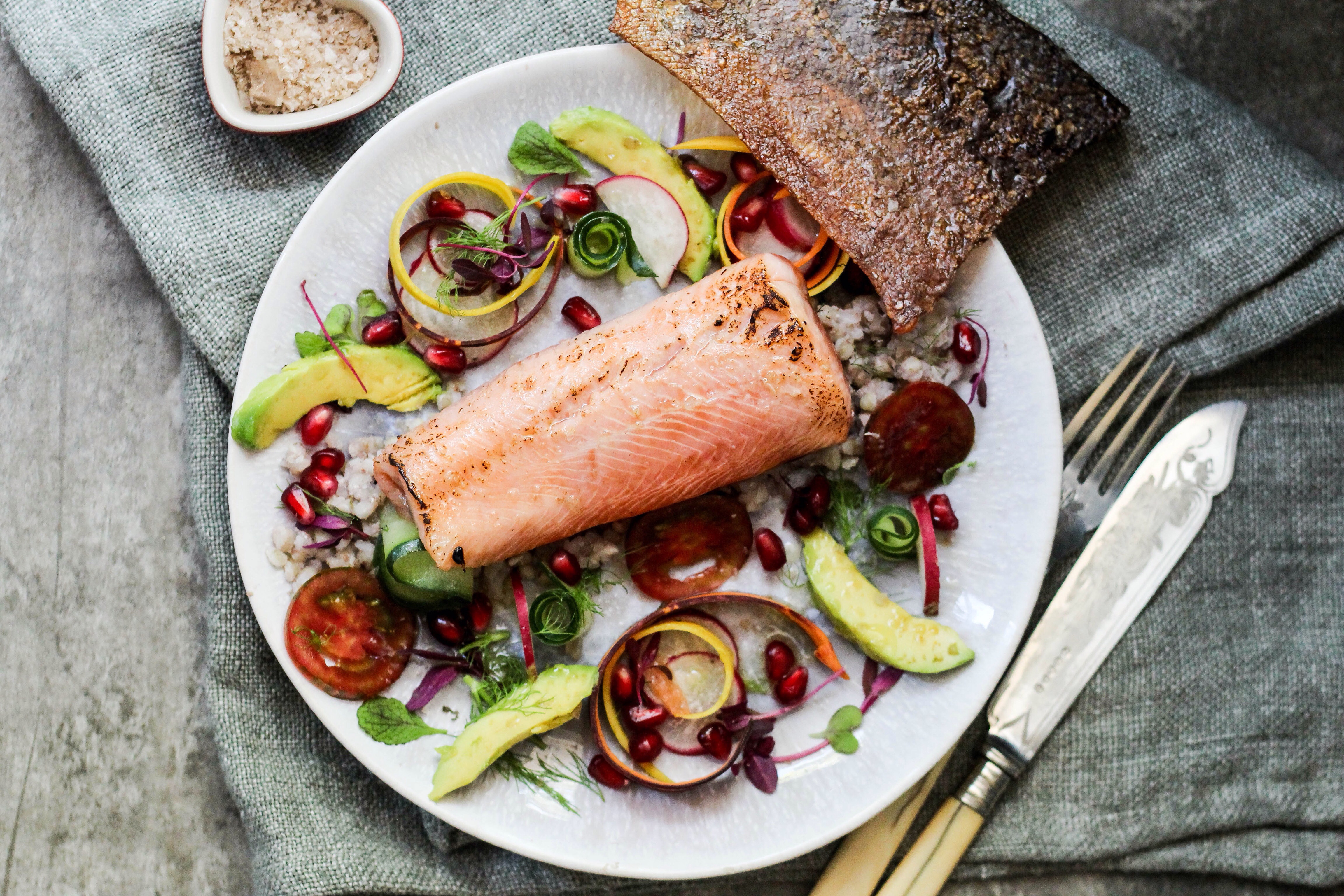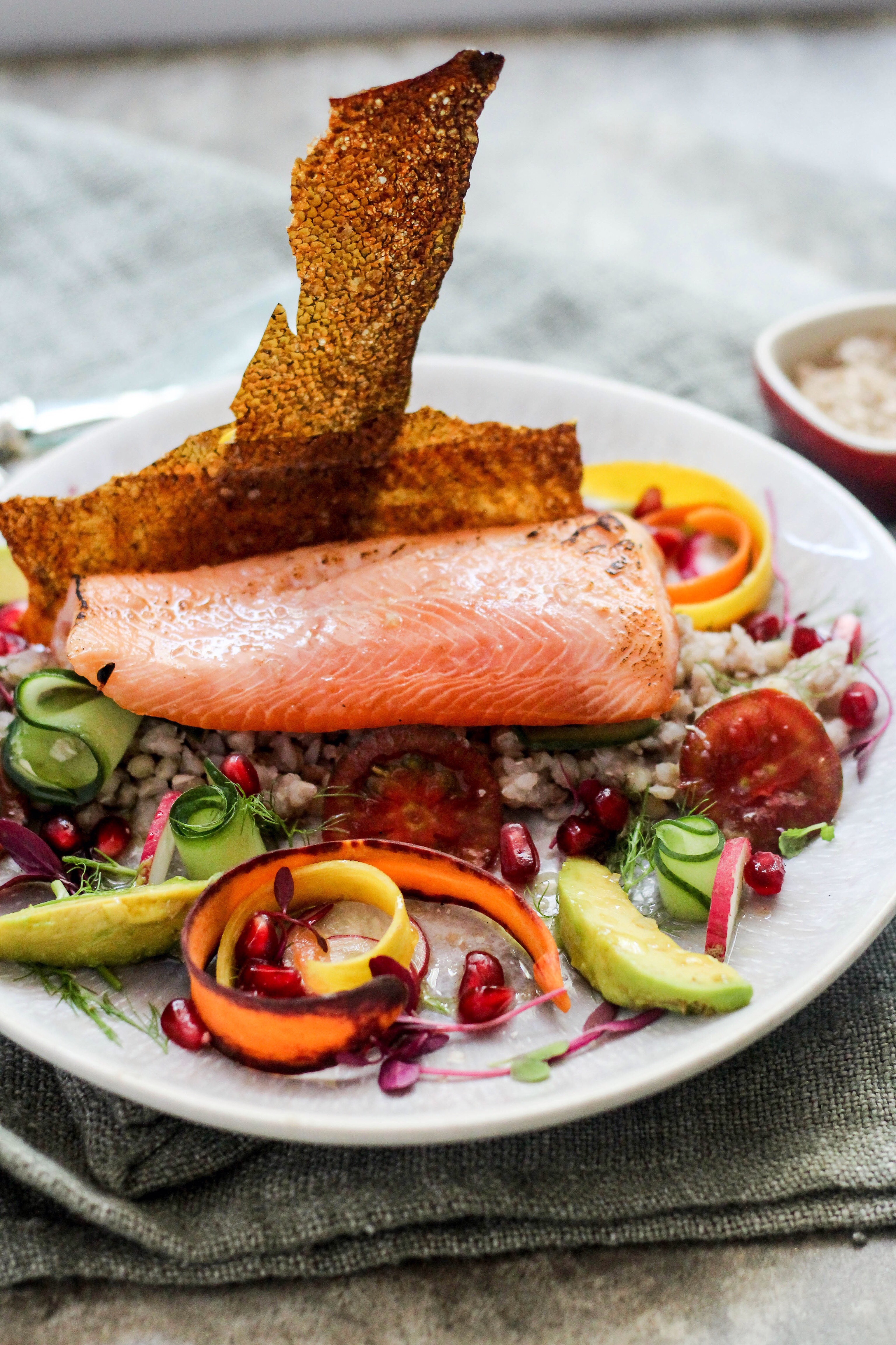 Slice the radish, tomatoes, avocado and drizzle with a little fresh lemon juice. Clean and peel the carrots into thin strips, if you like my presentation, you could curl the carrot strips and place on top of the radish on the plate.Arrange and assemble as you like, I placed the buckwheat in the middle of the plate in a line and placed the trout on top of the buckwheat and place the crispy trout skin over the fillet or break into shards and scatter over plate. Season to taste and drizzle with olive oil.