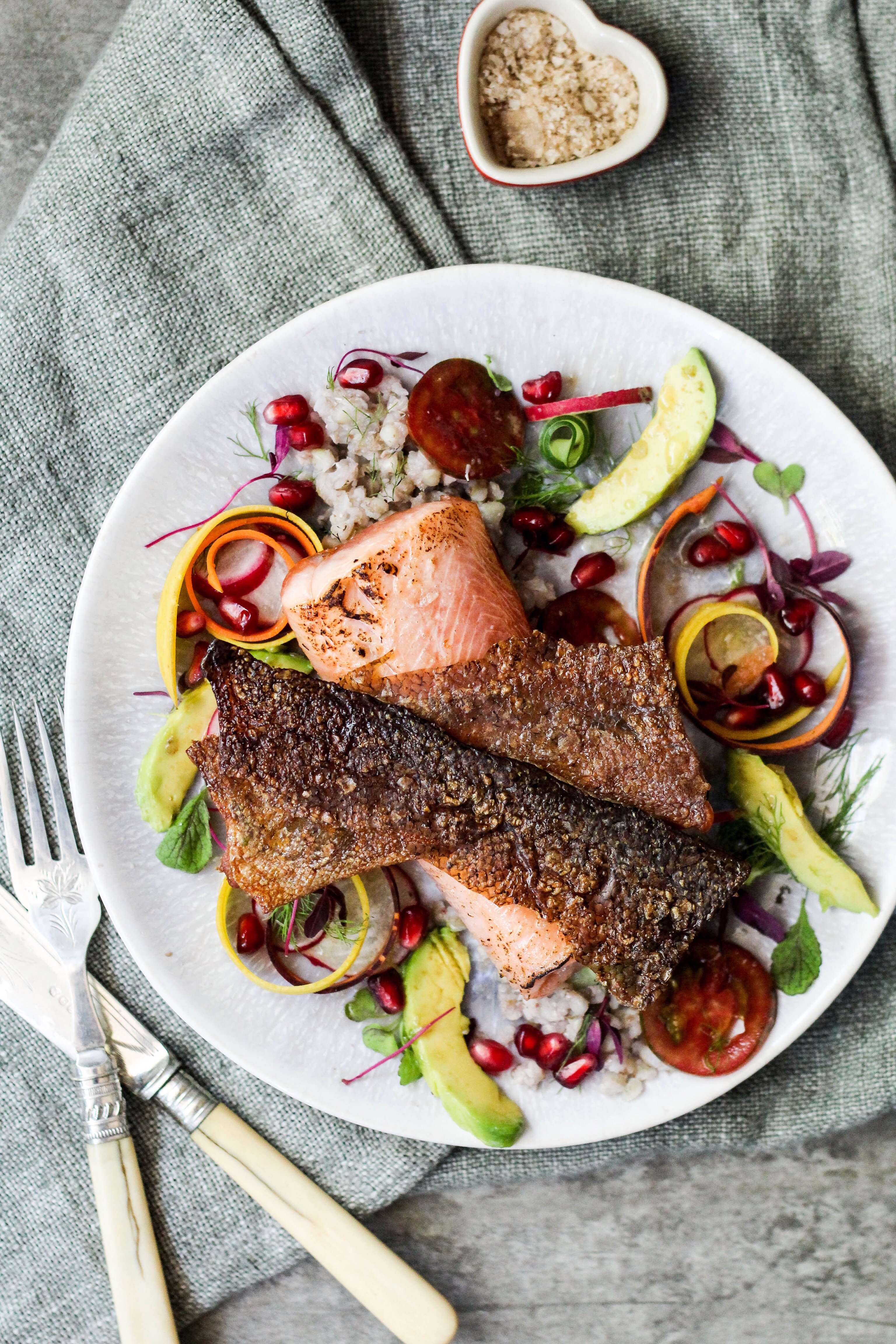 *If you like, you cod make a simple dressing of a little olive oil, lemon juice, honey and mustard, just enough to dress the plate. I didn’t make a dressing as the buckwheat wasn’t dry to warrant it, also the avocado lends a creamy texture to the dish to counteract with the crispyness of the skin and smokiness of the fish.