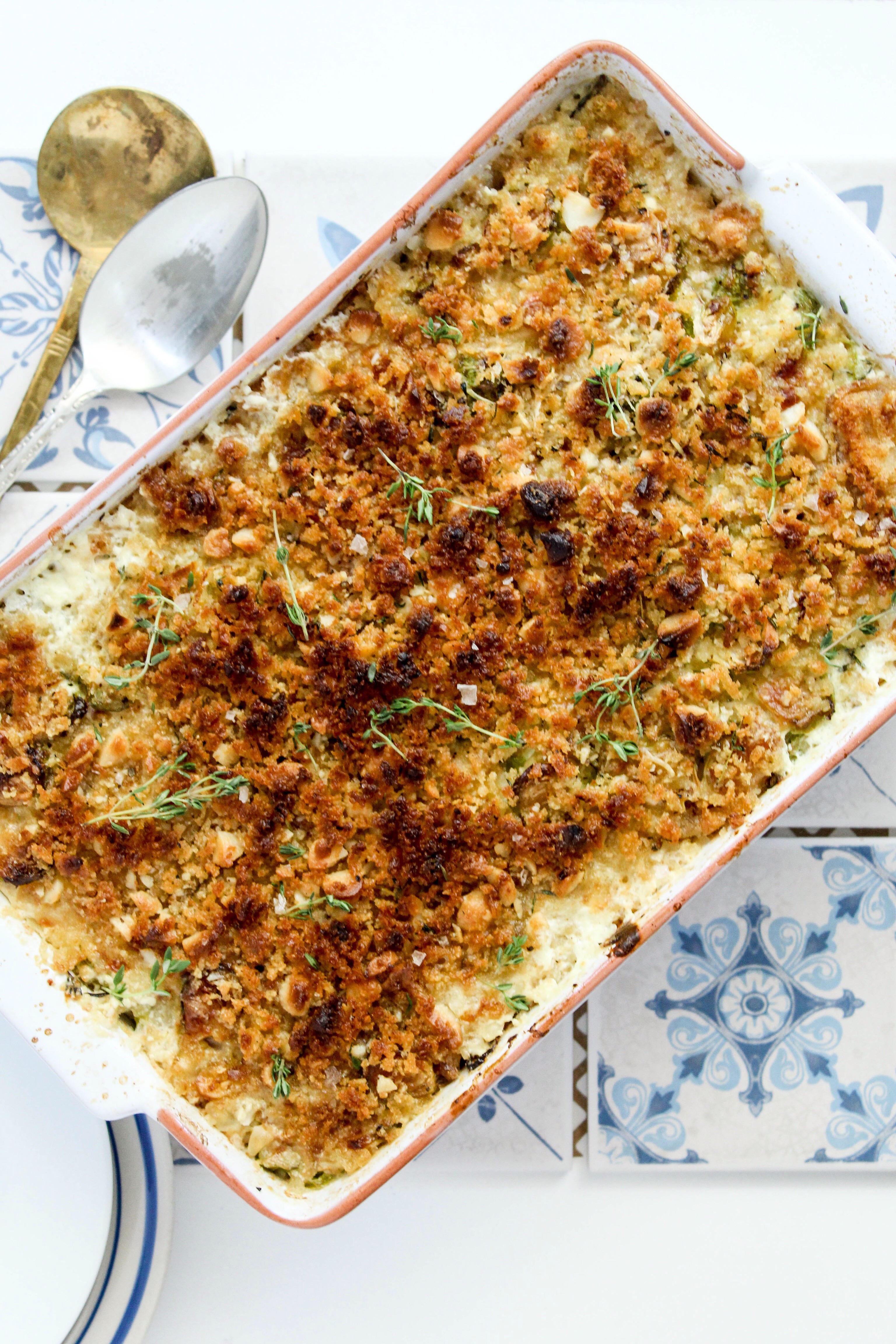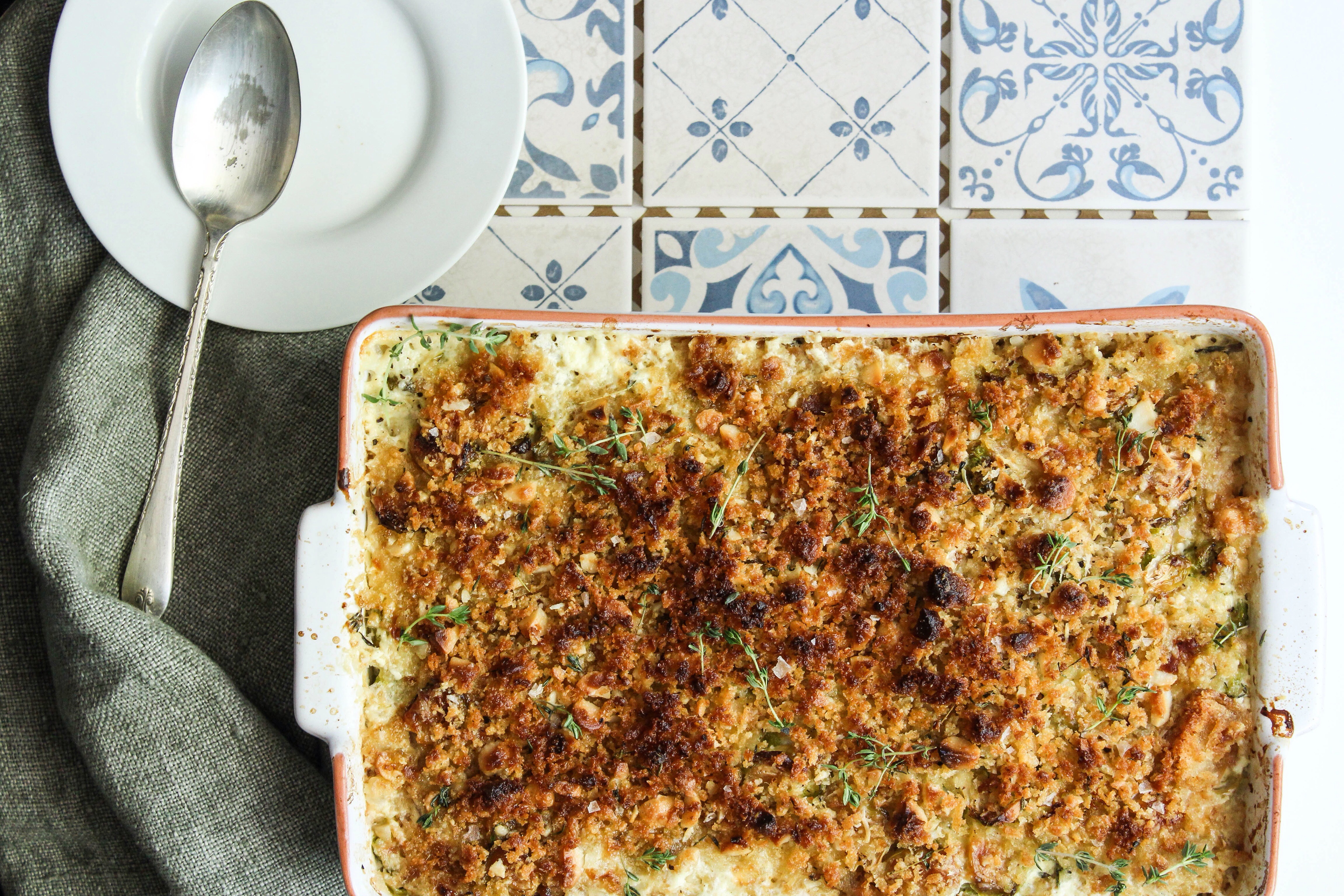 Place the bread in a food processor and pulse get breadcrumbs, place in a small bowl, add the chestnuts or macadamia nuts (whichever you could find or have on hand) oil and remaining thyme, and stir to combine. Sprinkle the nut crumb over the top of the vegetable mixture. Transfer to the oven and bake for 50-55 minutes or until the vegetables are soft and the top is bubbling and golden. Remove the gratin from the oven and set aside for a few minutes to cool slightly, then serve with a seasonal crisp salad.