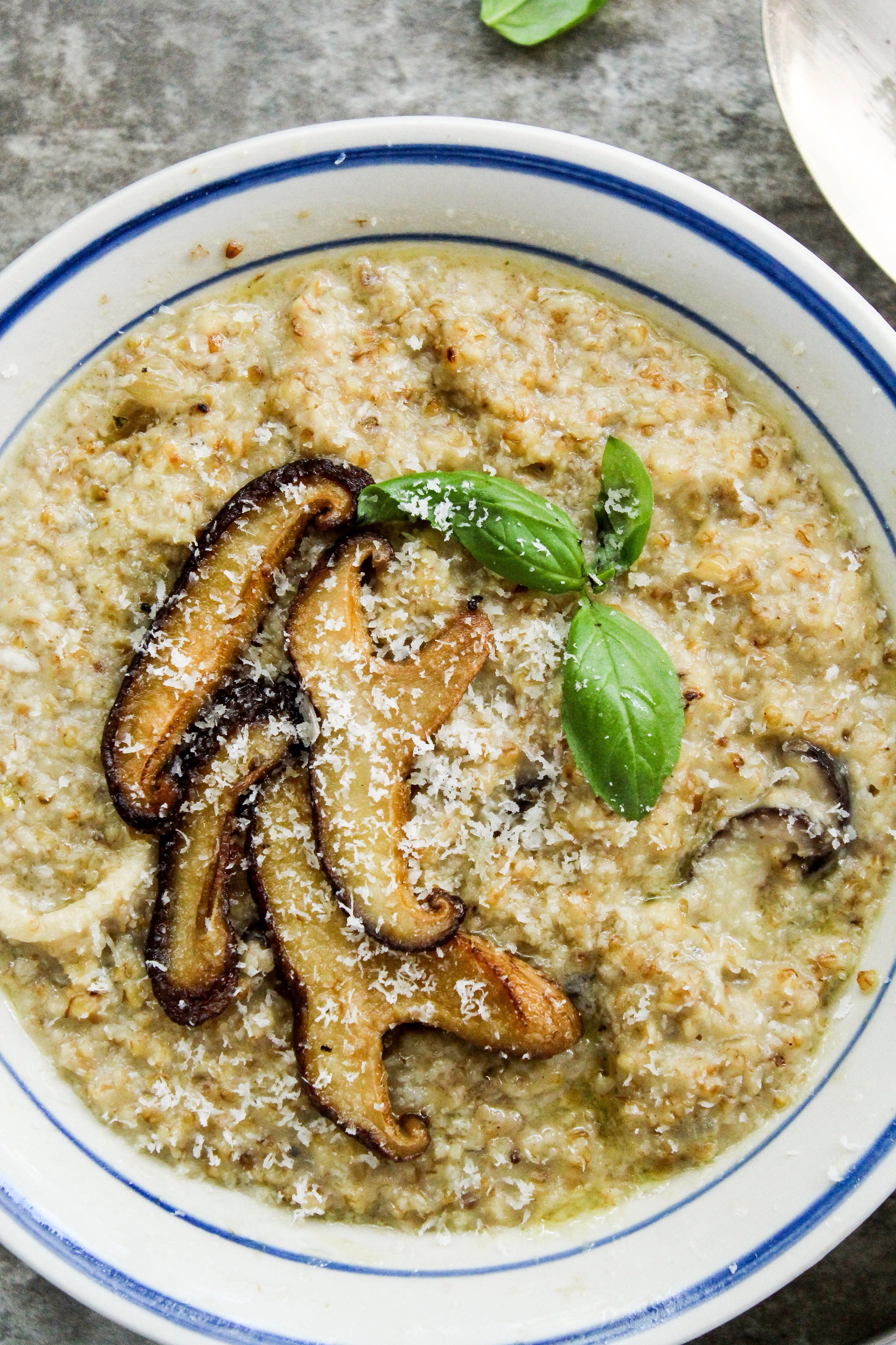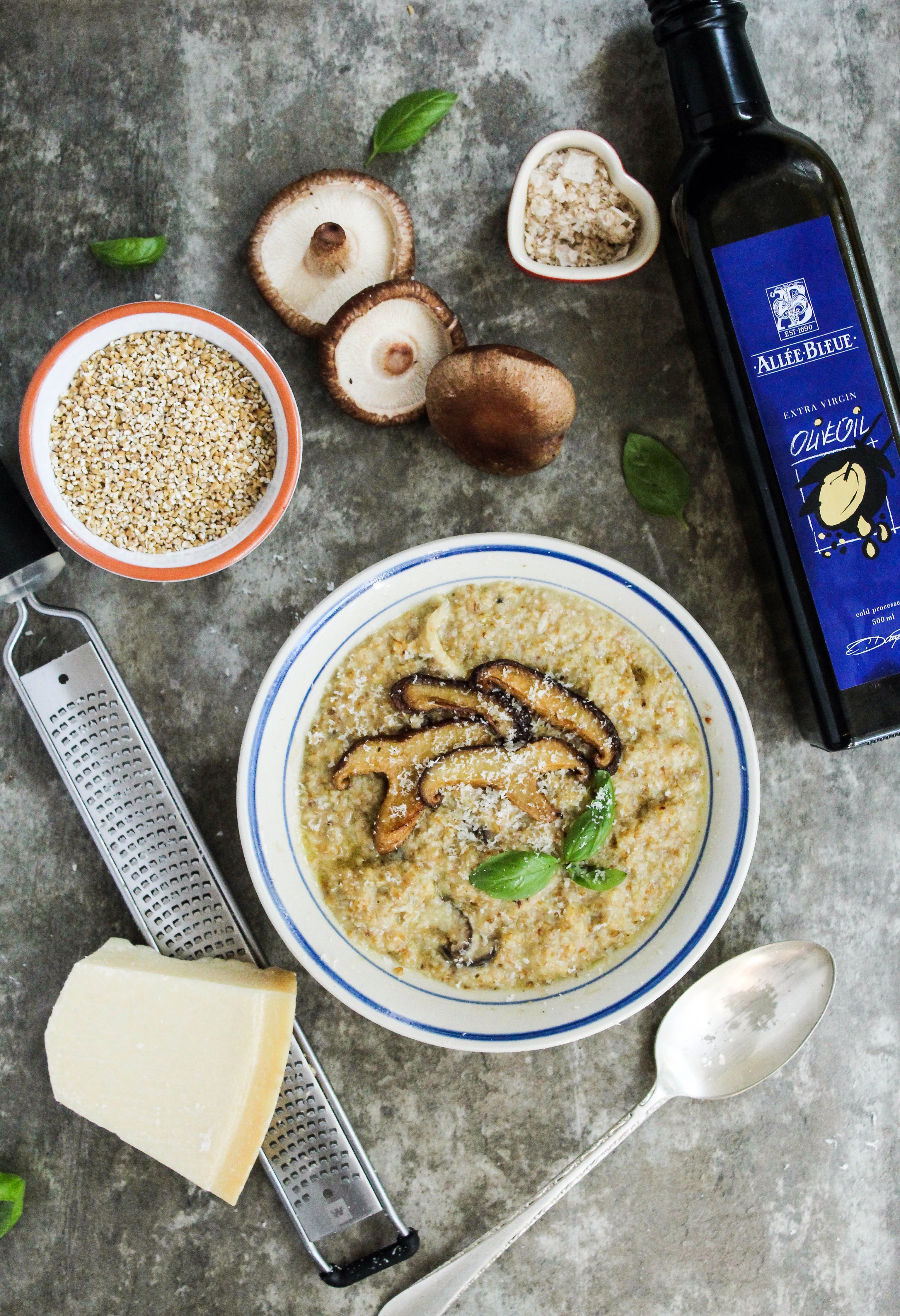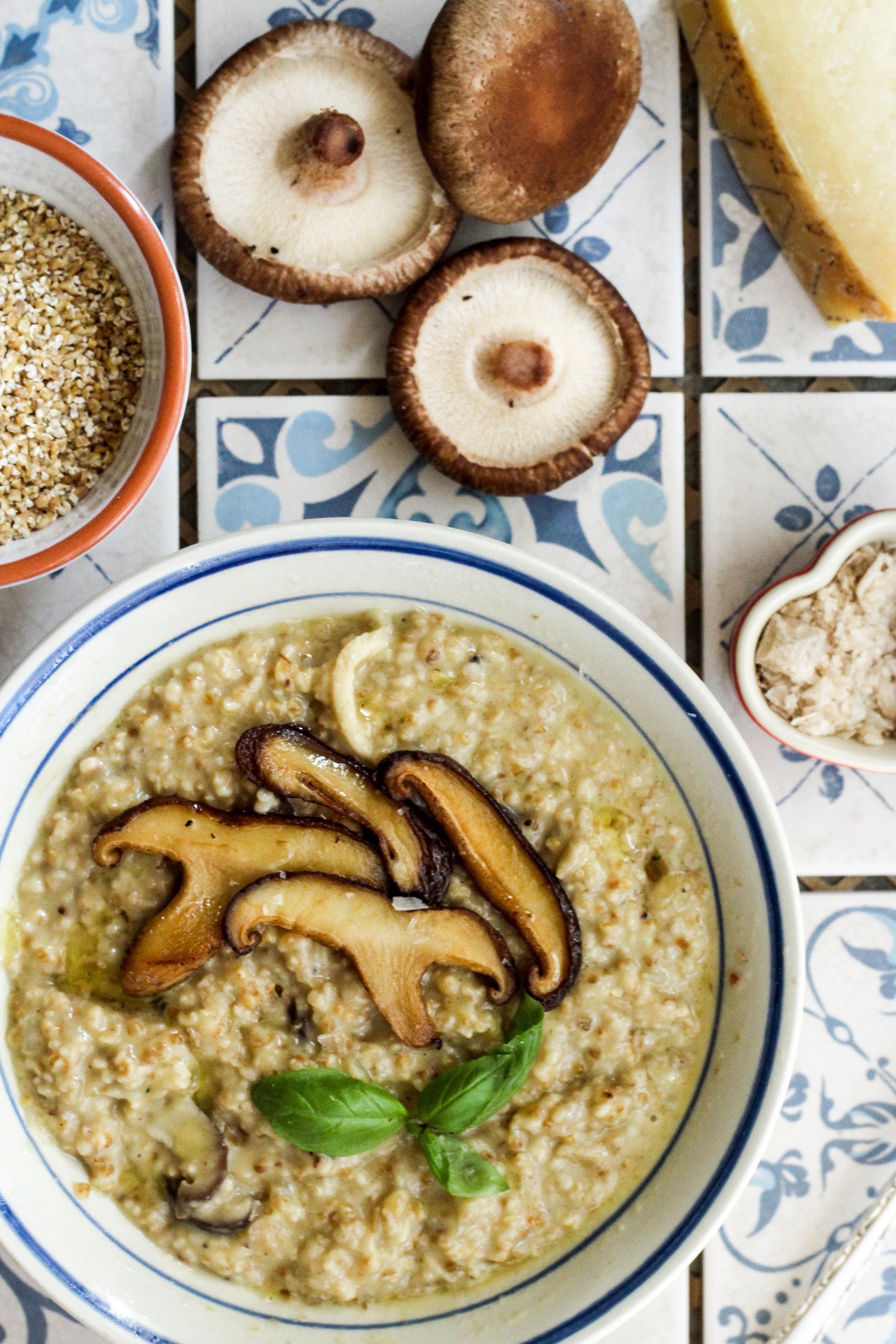 This recipe is adapted from the Savoury oatmeal risotto recipe from Geoffrey Zakarian, spotted on an episode of The kitchen. I love the unusual idea of savoury oats, as opposed to the accepted norm of oats, I.e honey drizzled oats, topped with fresh fruit or poached fruit, or simply sprinkled with brown sugar and dusted with cinnamon. I’m crazy about mushrooms, and always love experimenting with different kinds and variations. I added dried porcini to the chicken stock to add the extra kick of umami and meatiness to the risotto, added chopped shiitake mushrooms for added texture and flavour.